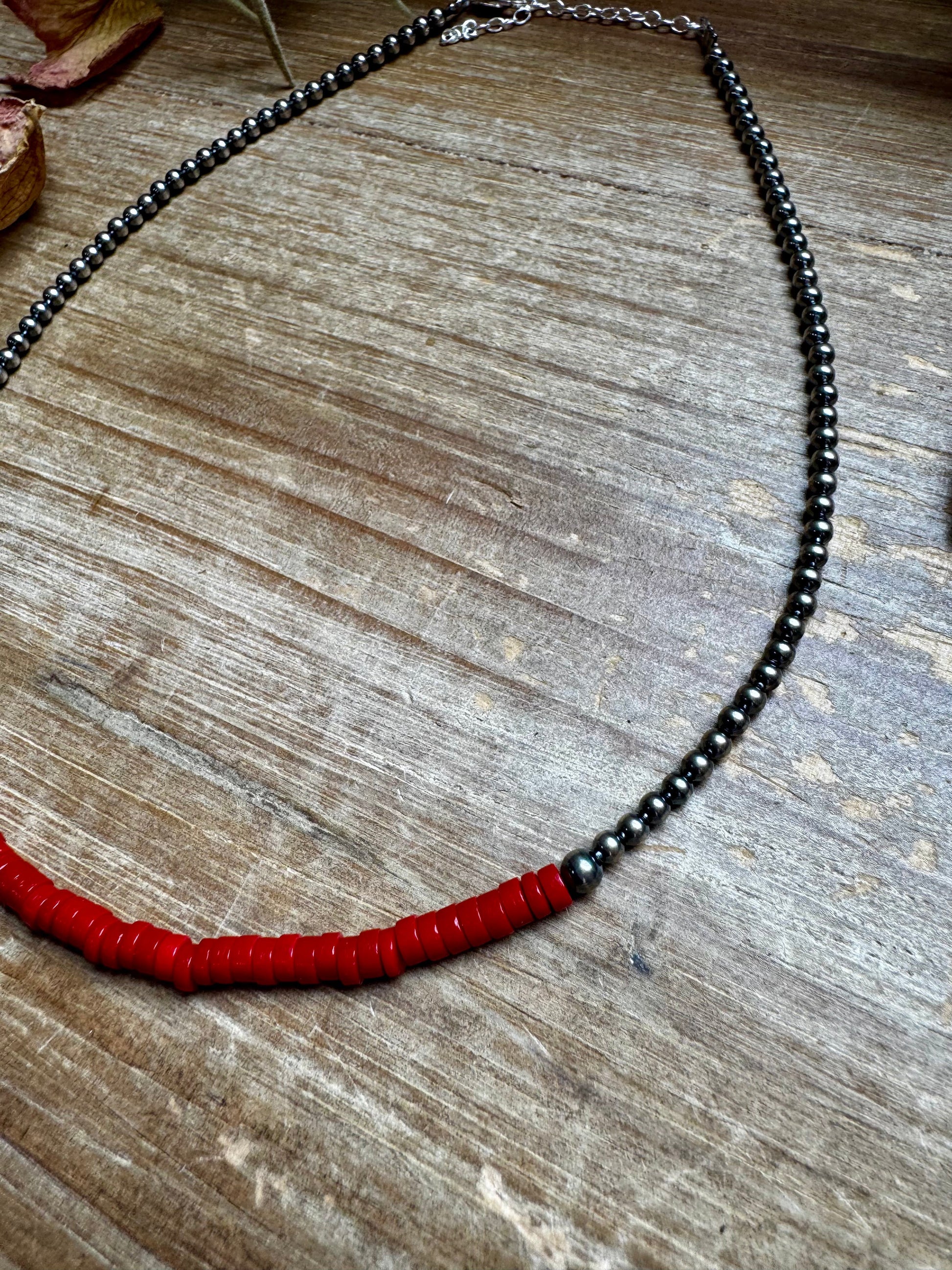 15-Inch Red Magnesite Heishi Necklace – Sterling Silver Pearls, Handmade