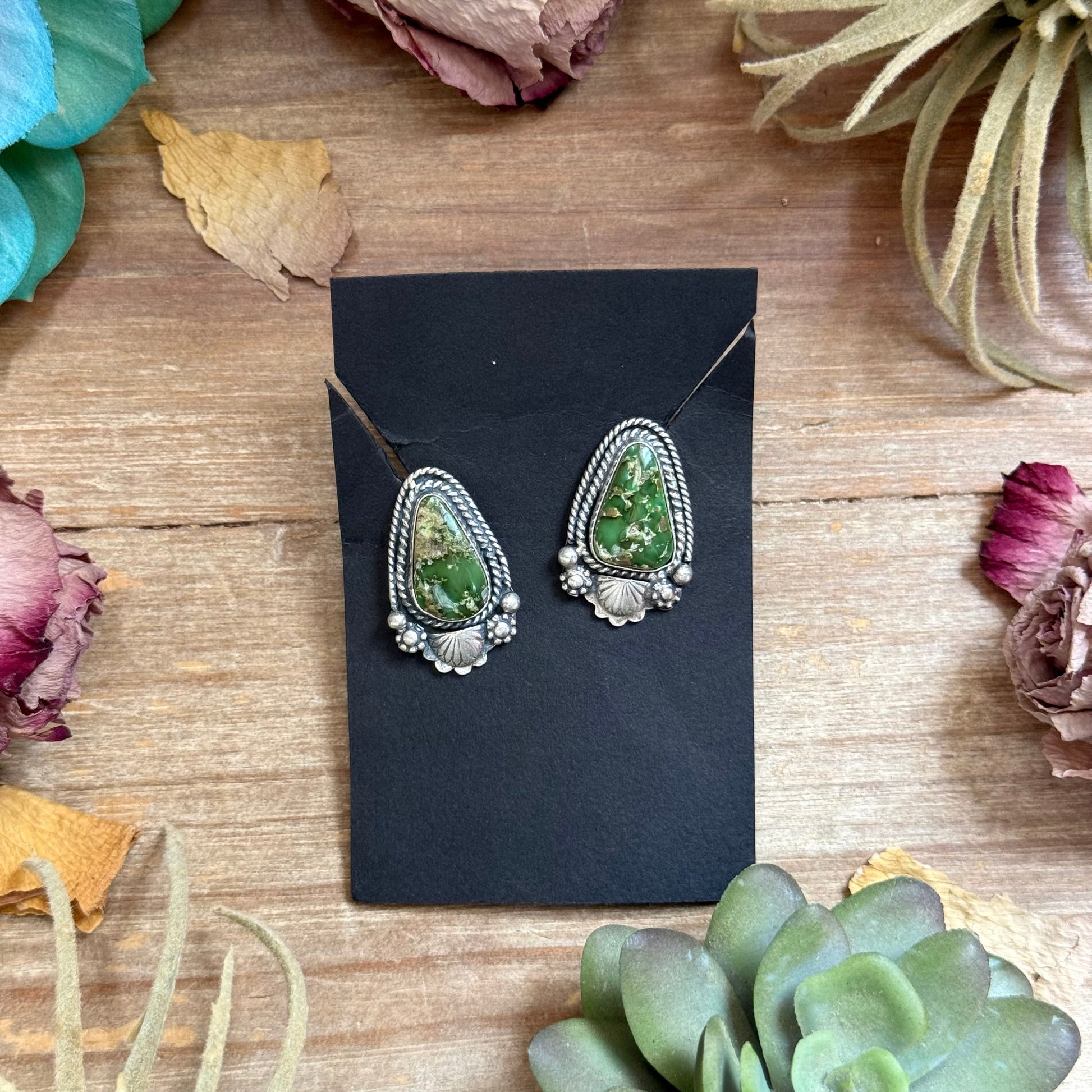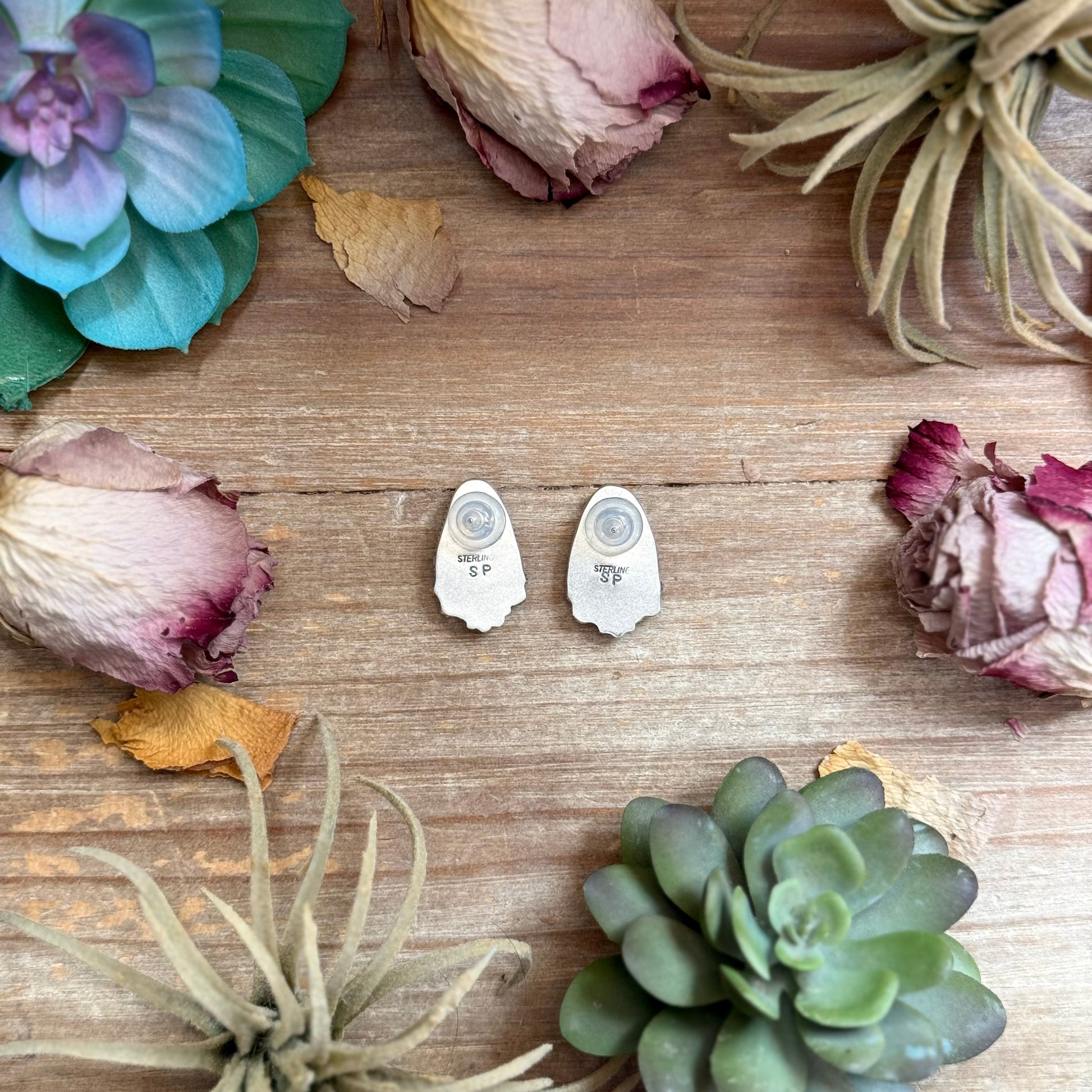 A vibrant pair of stud earrings handcrafted in the USA by artist Shay Pfeiffer for Black Wolf White Wolf. These sterling silver earrings feature beautiful Sonoran Gold turquoise stones, known for their striking blend of blues and greens with natural matrix.