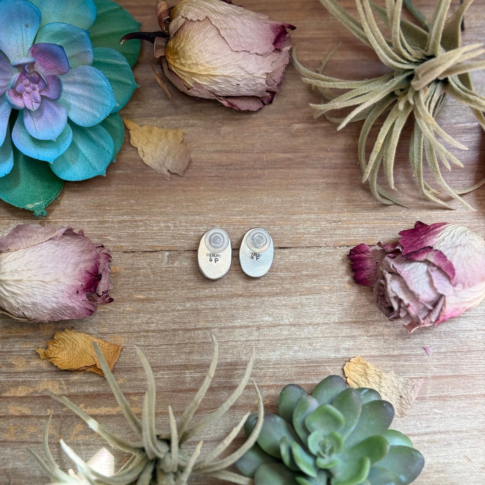 A refined pair of stud earrings handcrafted in the USA by artist Shay Pfeiffer for Black Wolf White Wolf. These sterling silver earrings feature beautiful Dry Creek turquoise stones, known for their soft, pale tones and distinctive natural character.