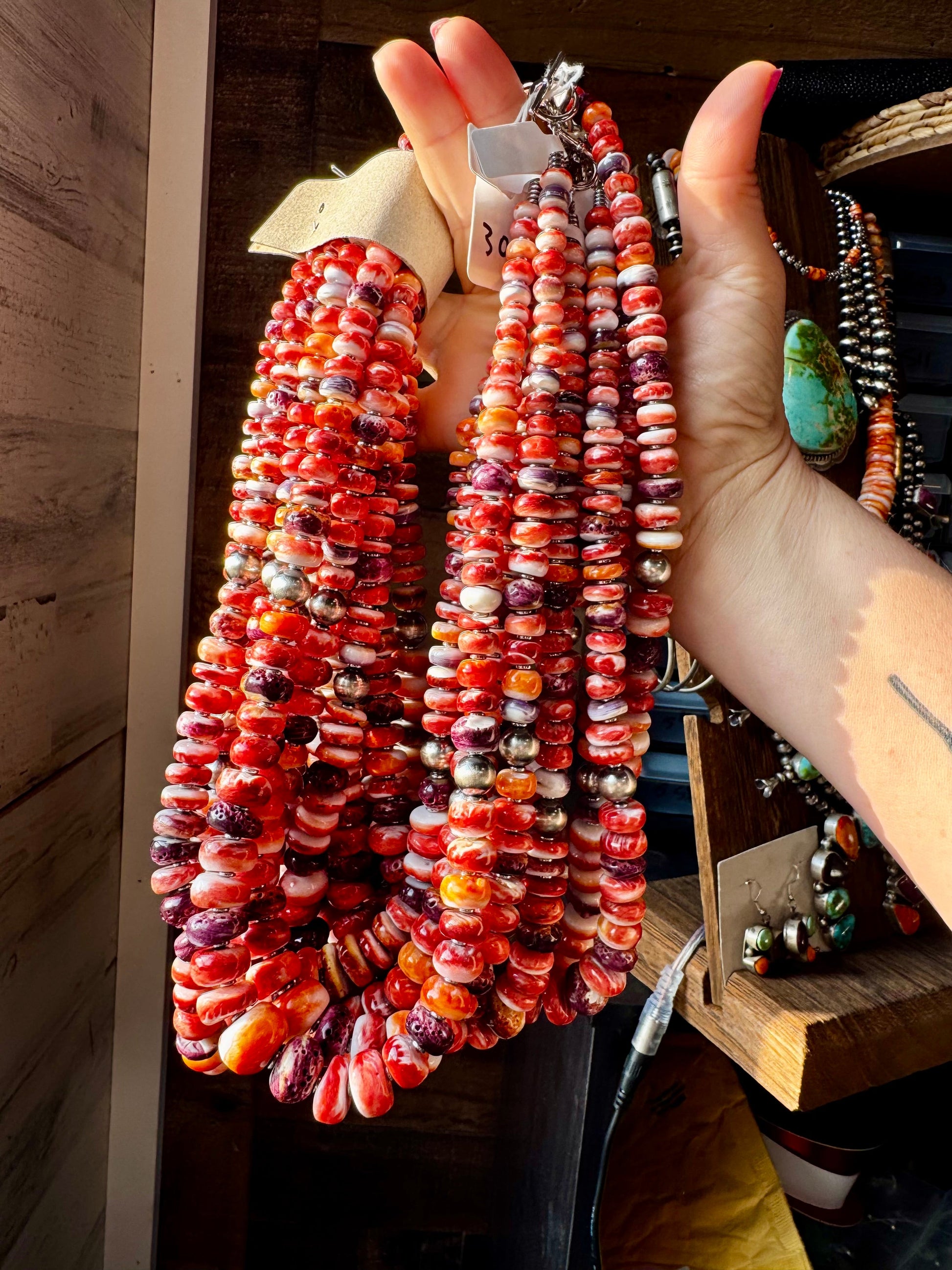 This exclusive 22-inch necklace features a rare mix of spiny oyster beads in vibrant orange, red, and purple, paired with deep-toned purple wampum shell. Spaced with hematite saucers and finished with two bold 10mm sterling silver pearls, this piece is a showstopper.