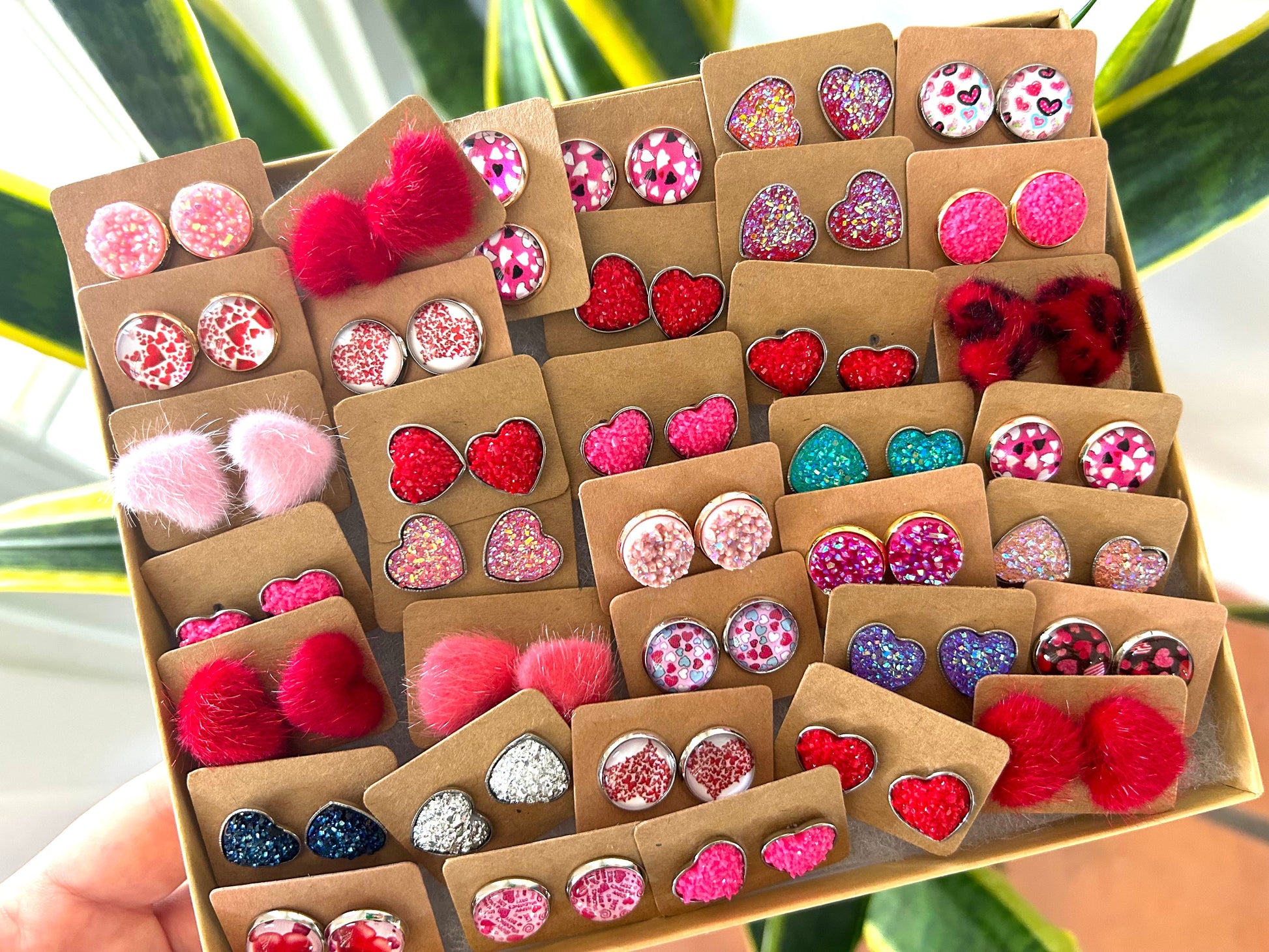 You will receive a mix of 35 pairs fuzzy hearts, druzy hearts and round earrings!