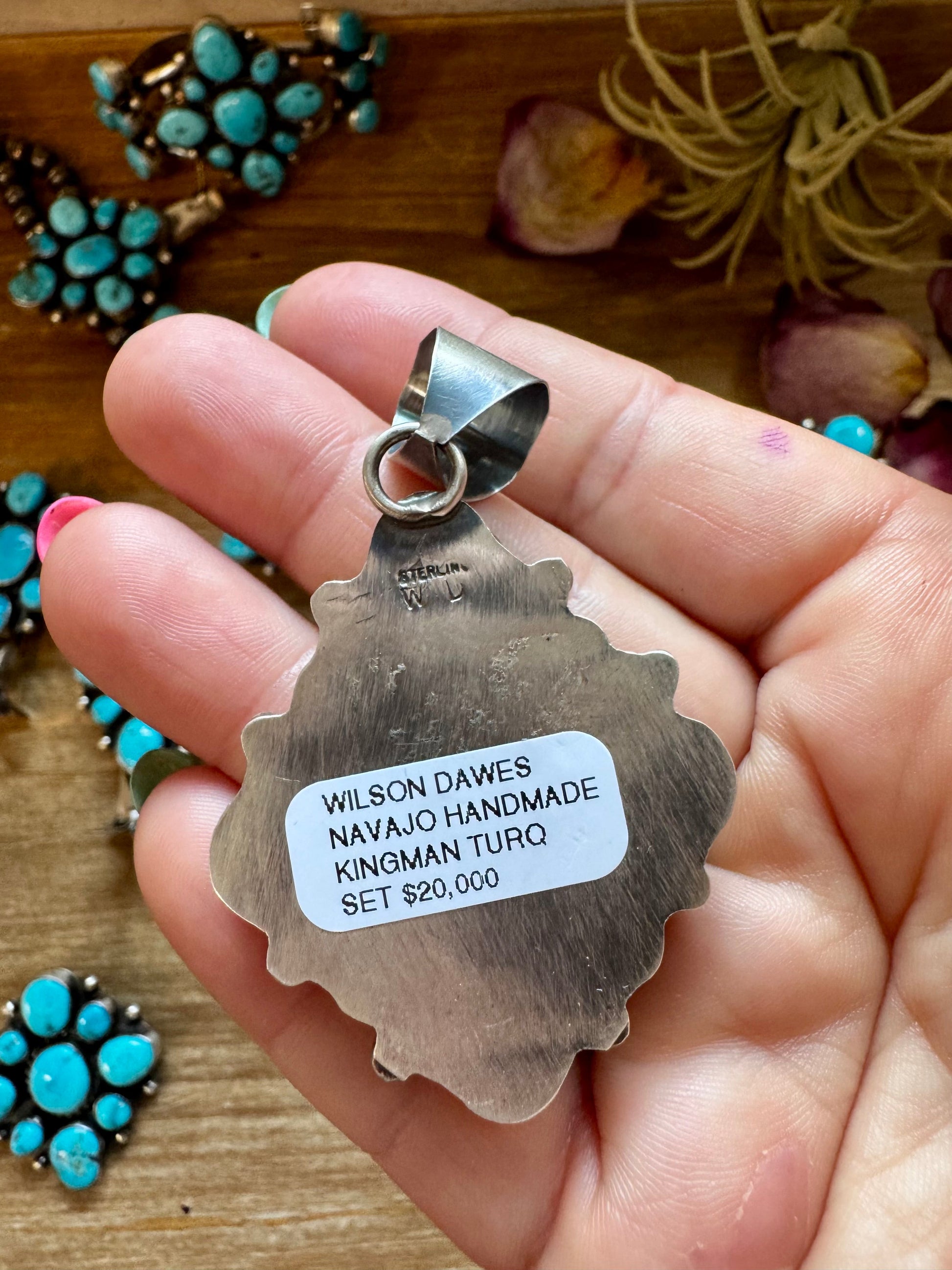 A masterpiece of Native artistry — this complete squash blossom set is truly one of the most extraordinary collections ever created. Handmade in the USA by Navajo silversmith Wilson Dawes, each piece is stamped sterling and features genuine Kingman turquoise. The craftsmanship, heritage, and presence of this set place it in a class of its own — an heirloom to be treasured for generations.