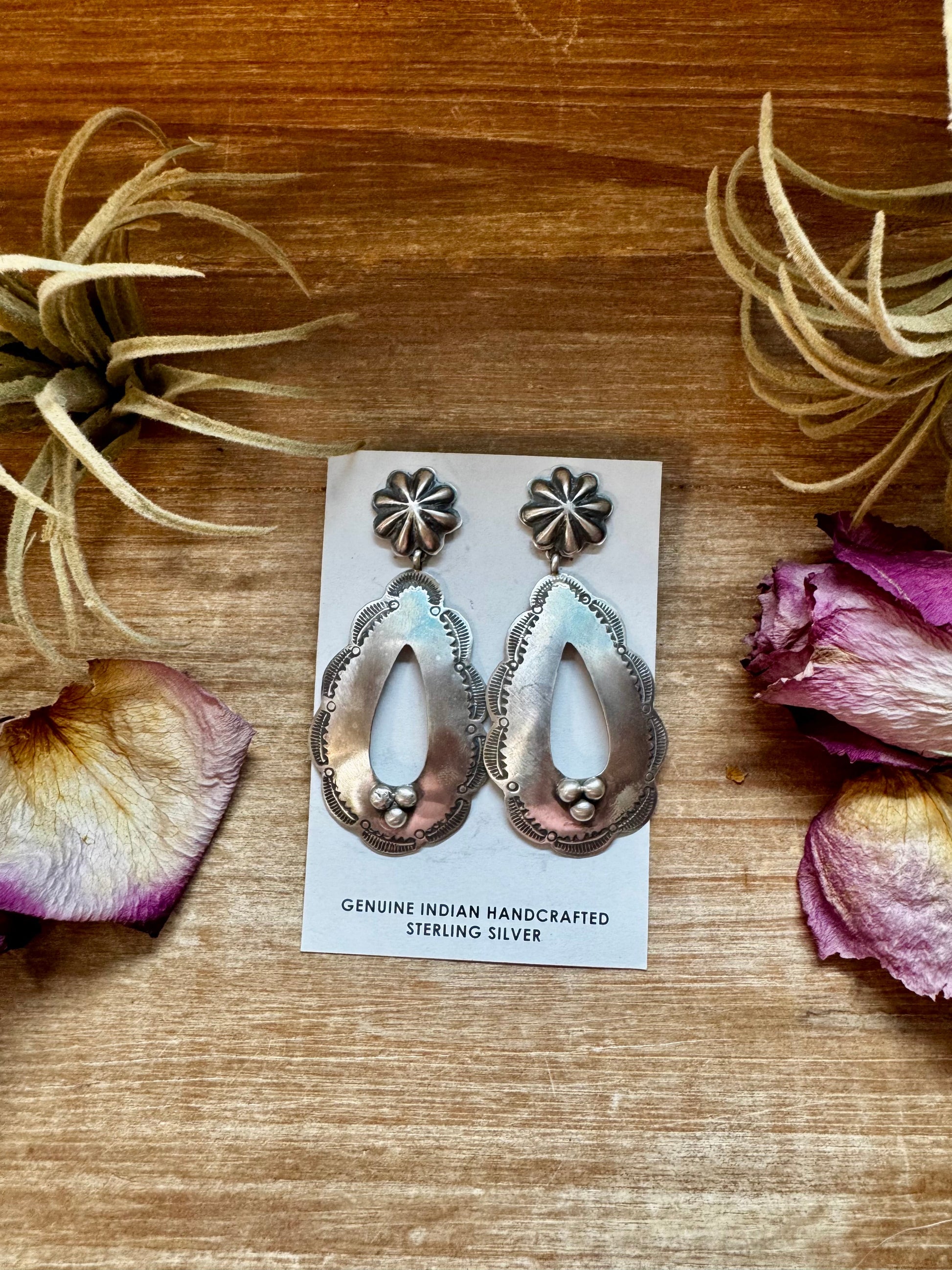 Handmade in the USA, these sterling silver earrings feature a detailed stamped concho with a teardrop dangle for added movement. Crafted by Native artisan RL and stamped sterling for authenticity, this pair showcases exceptional silverwork. Lightweight and easy to wear, these earrings are one of a kind — only one pair available.