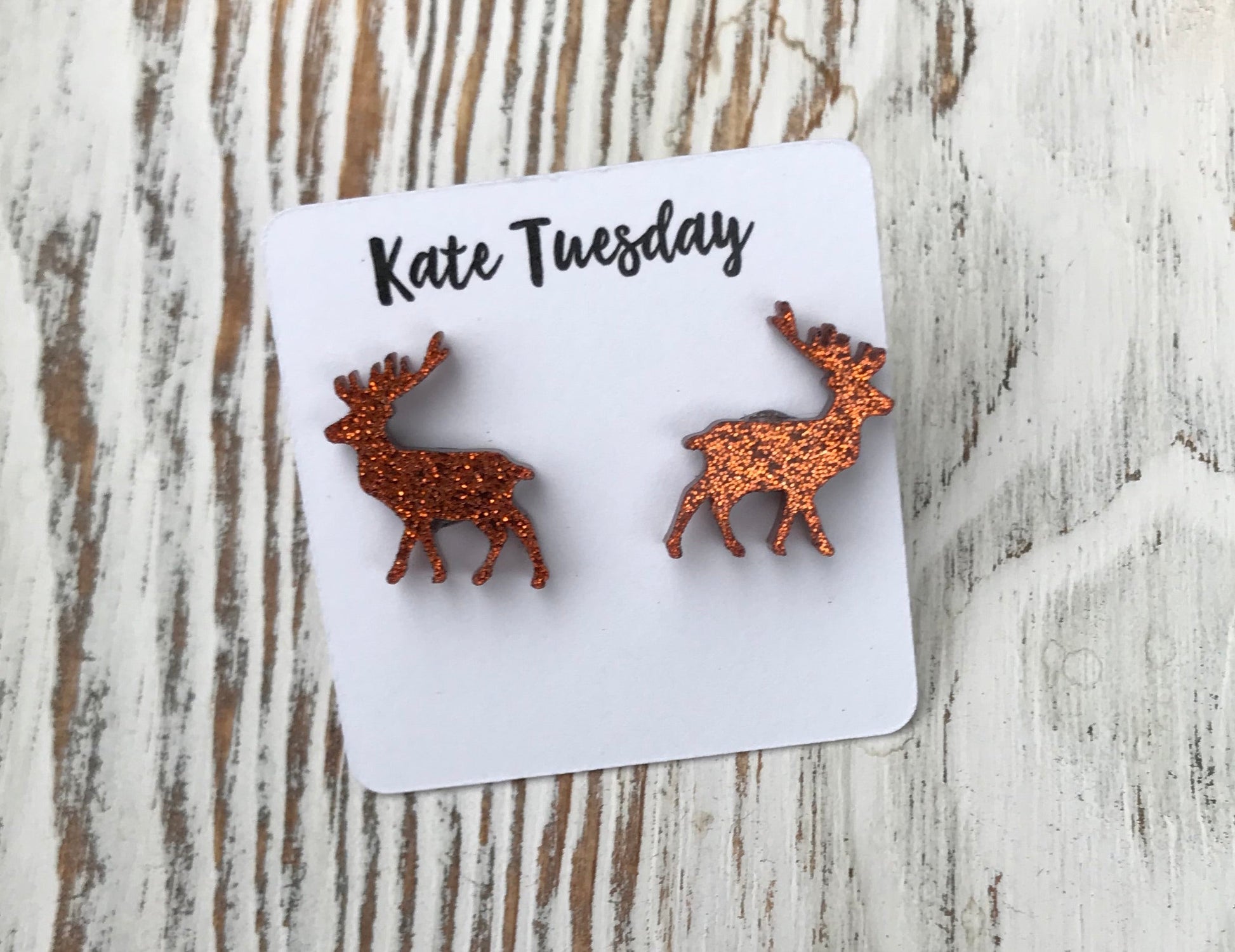 Copper Sparkly Reindeer Acrylic Holiday Stud Earrings