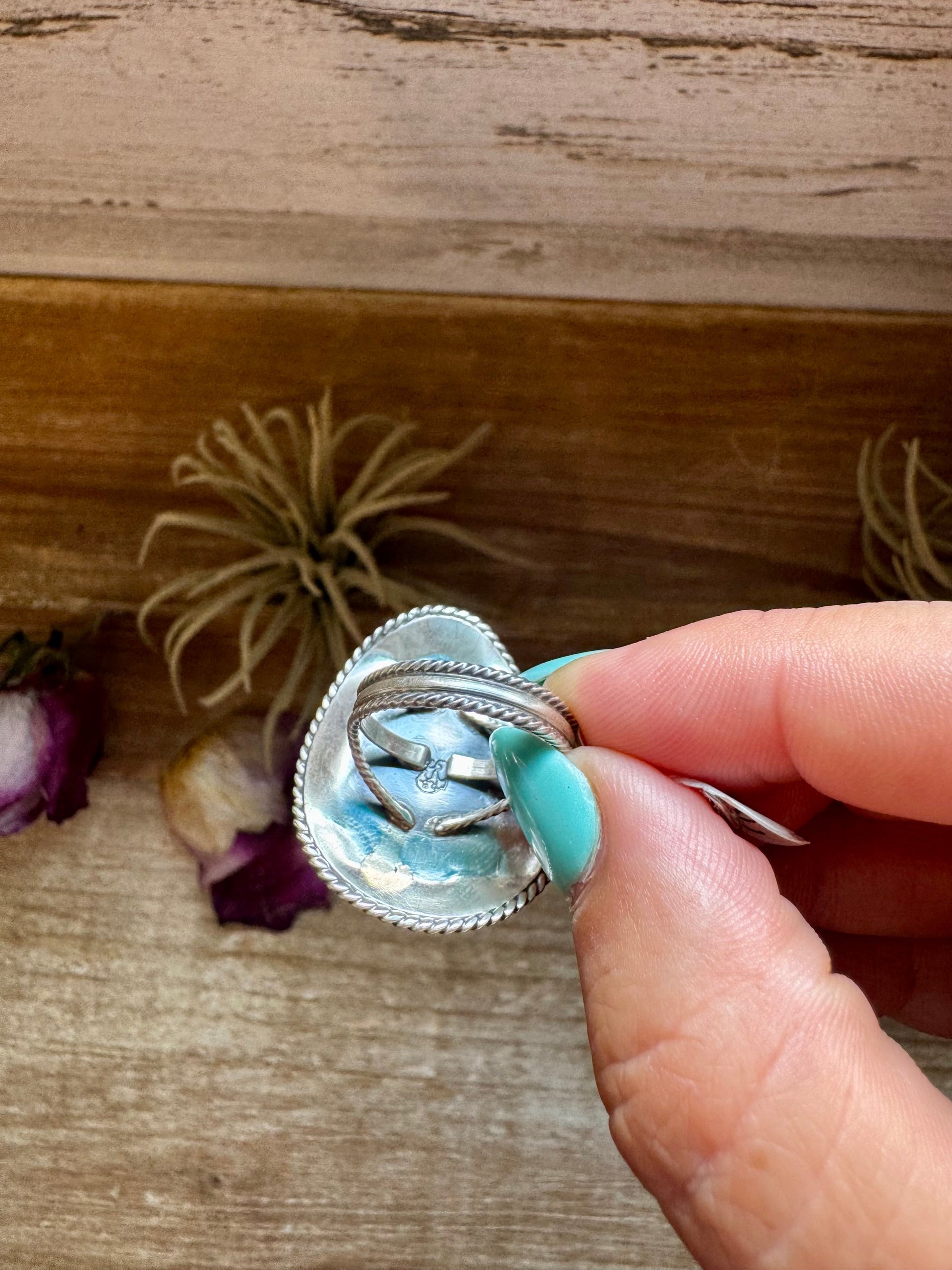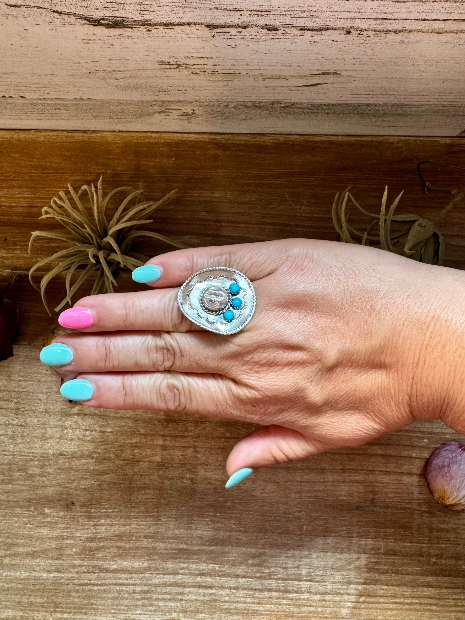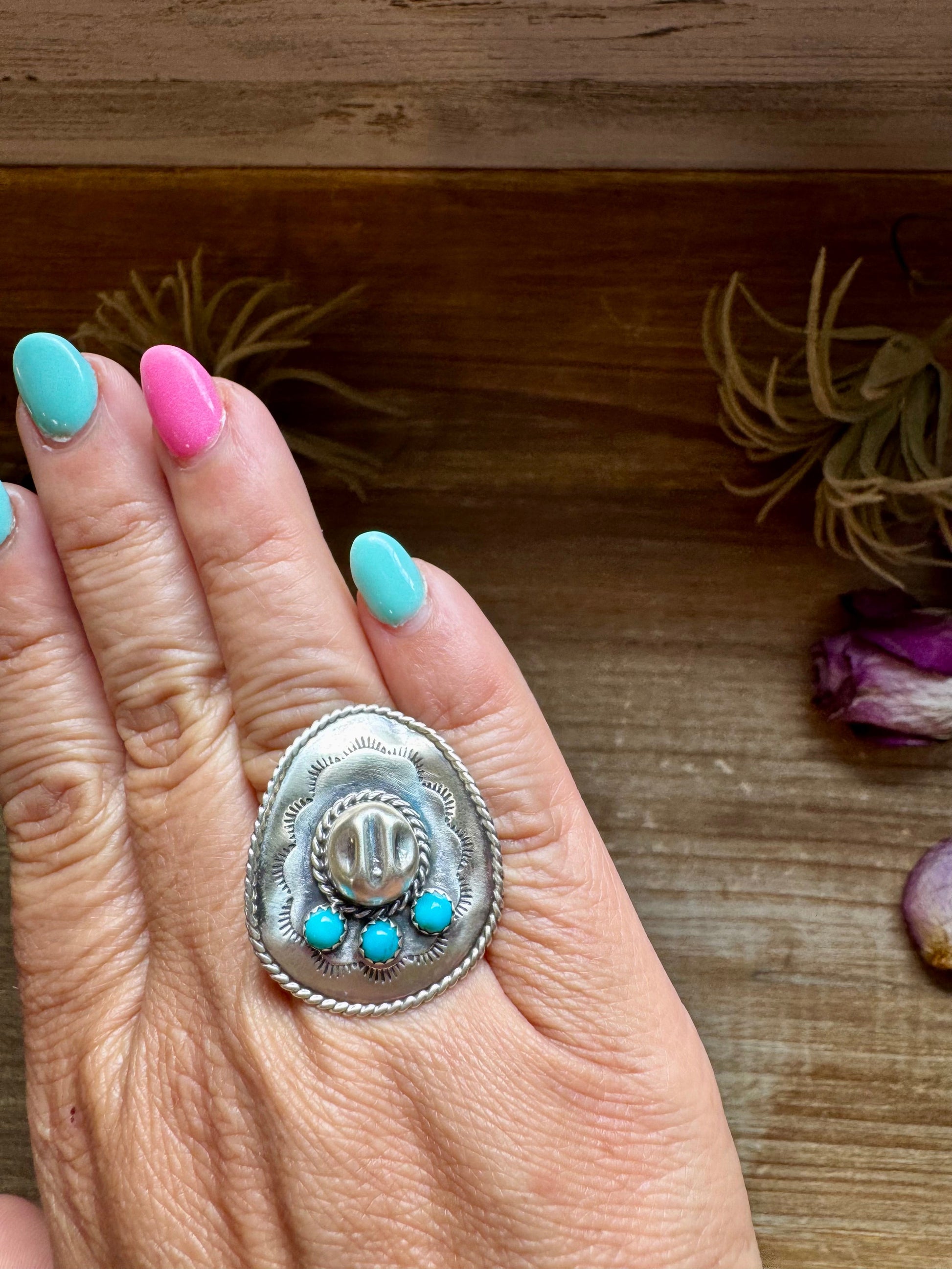 Cowboy Hat Ring with Kingman Turquoise – Triple Stone – Size 7.5 – Sterling Silver