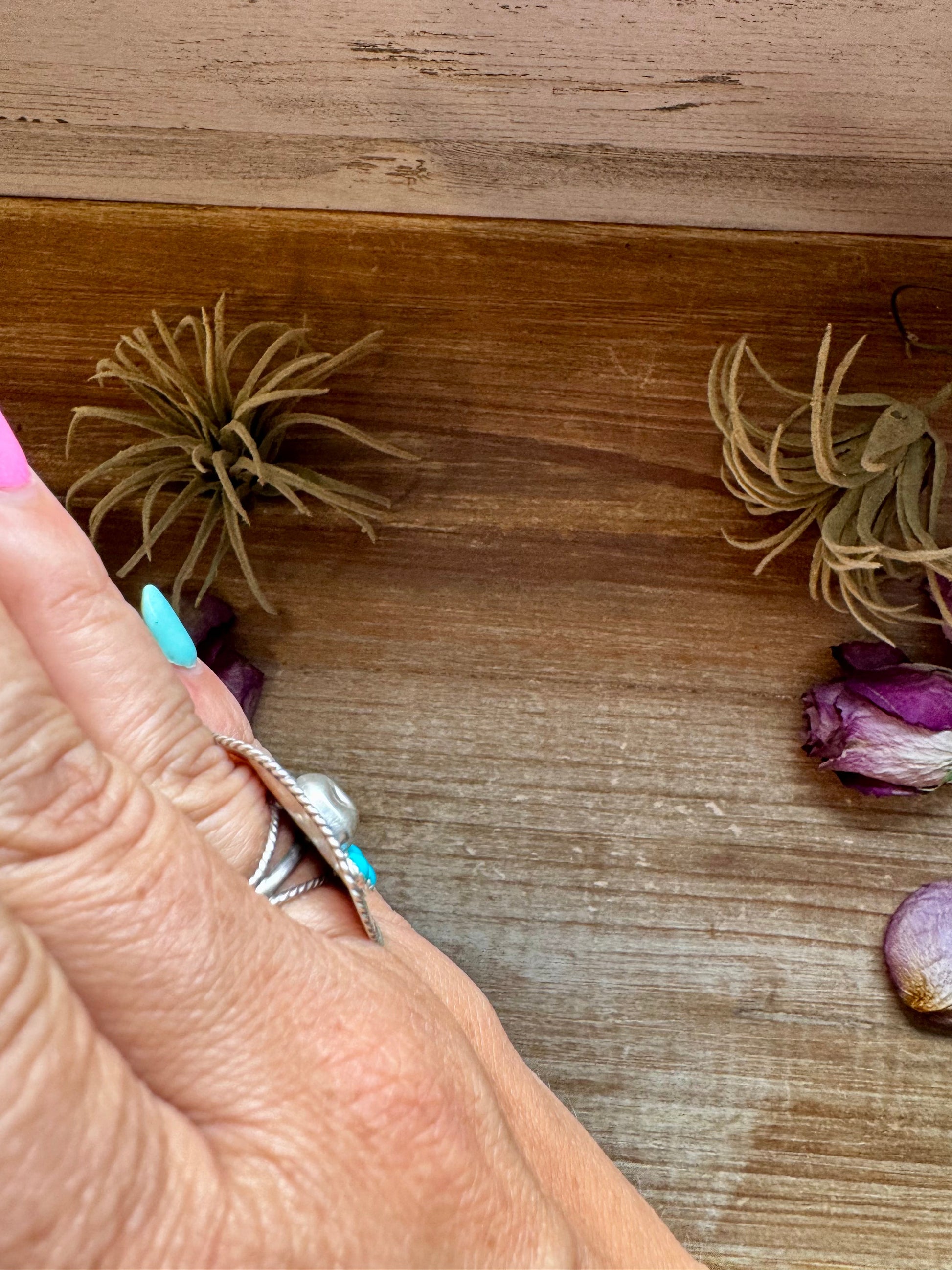 This one-of-a-kind sterling silver cowboy hat ring is handmade in the USA by Native artisans. The unique design features three genuine Kingman turquoise stones set across the hat’s crown. Stamped sterling for authenticity, each stone shows natural variation in color and matrix. Available in size 7.5 — and there’s only one.