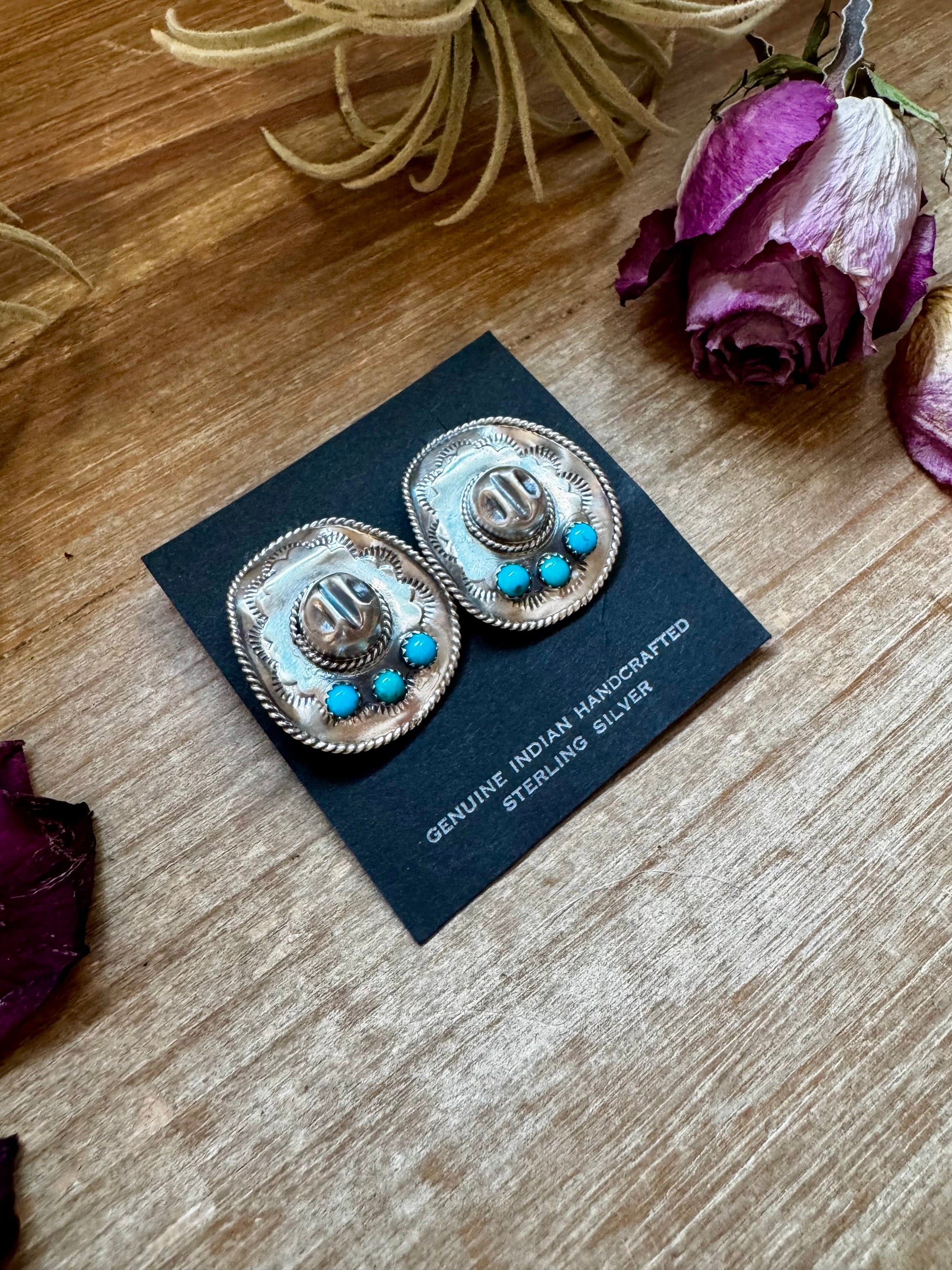 Handmade in the USA by Navajo silversmith Bobby Platero, these sterling silver cowboy hat stud earrings feature genuine Kingman turquoise set at the center. Large in size yet lightweight enough for comfortable wear, they showcase detailed silverwork and are stamped for authenticity. A bold Western design and a true statement piece.