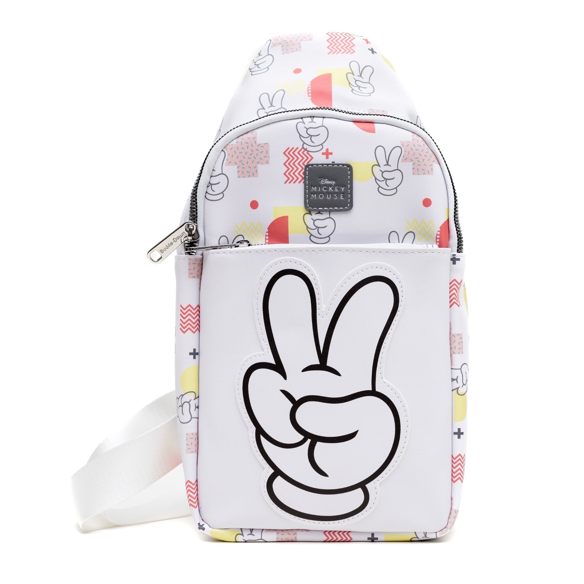 Disney Vegan Leather Crossbody Sling Bag, Mickey Mouse Peace Fingers Applique and Icons Collage, White, 7" x 14"