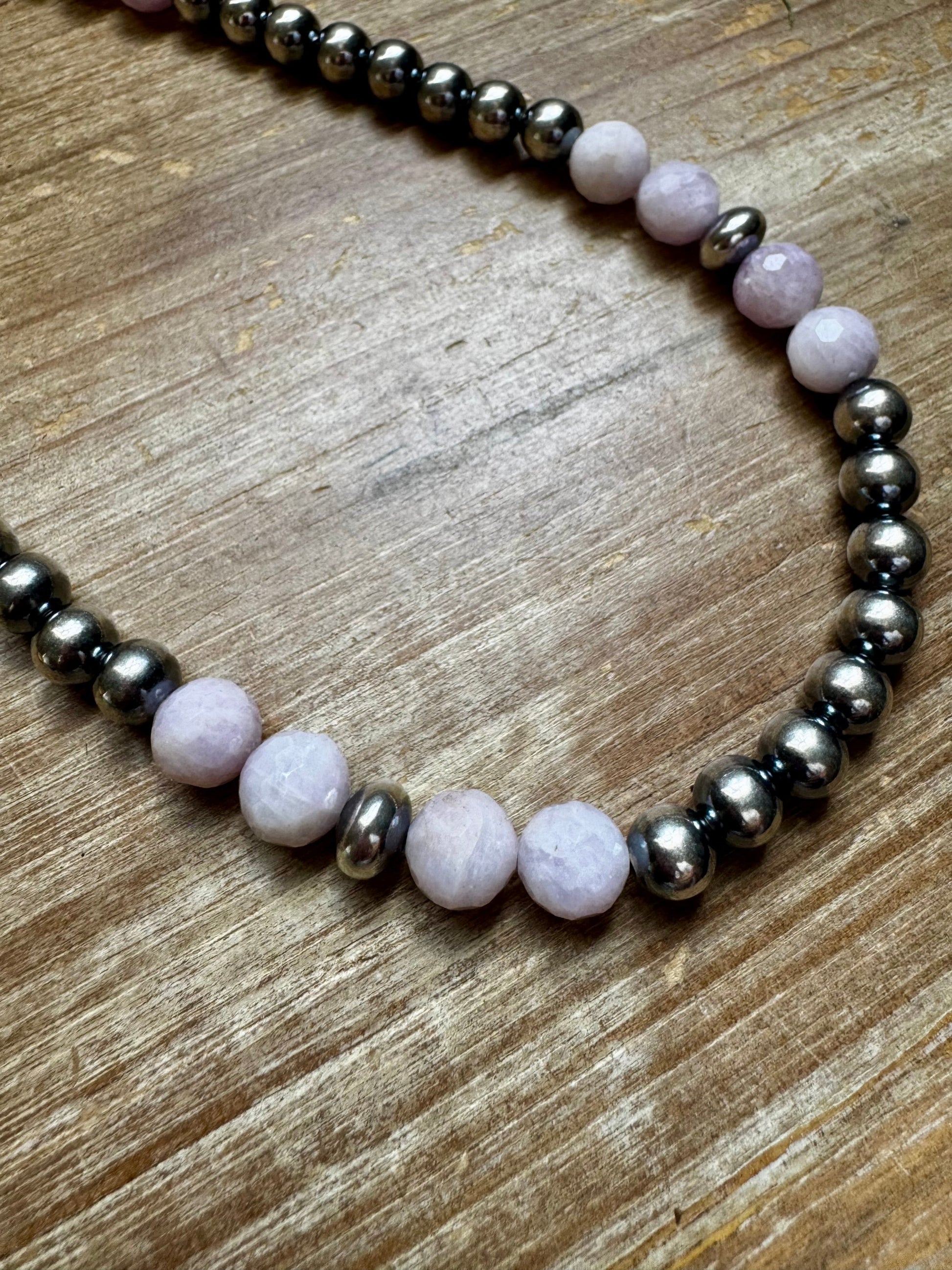 Elegant and soft with a subtle glow, this handmade necklace features 8 mm sterling silver pearls paired with beautifully faceted 8 mm Kunzite beads in varying shades of light purple and lavender. The faceted cut adds extra sparkle, making this a standout yet versatile piece. Each Kunzite bead is unique in color and character.