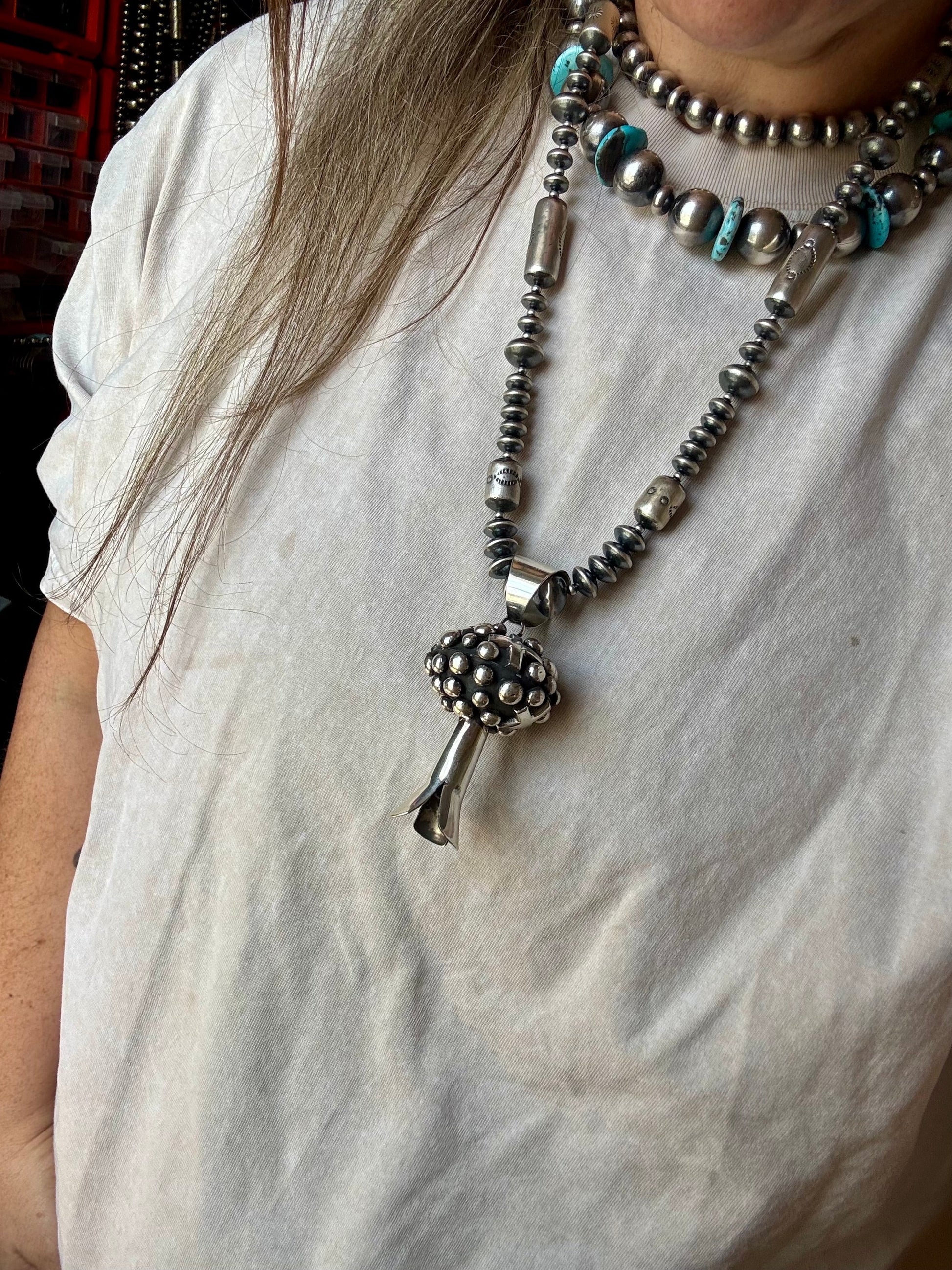 his 24-inch necklace features a stunning graduated design with sterling silver saucer beads and barrel-shaped beads. Handstrung in the USA, this piece brings timeless elegance with a bold Western flair. A classic collector’s piece with great weight and shine.