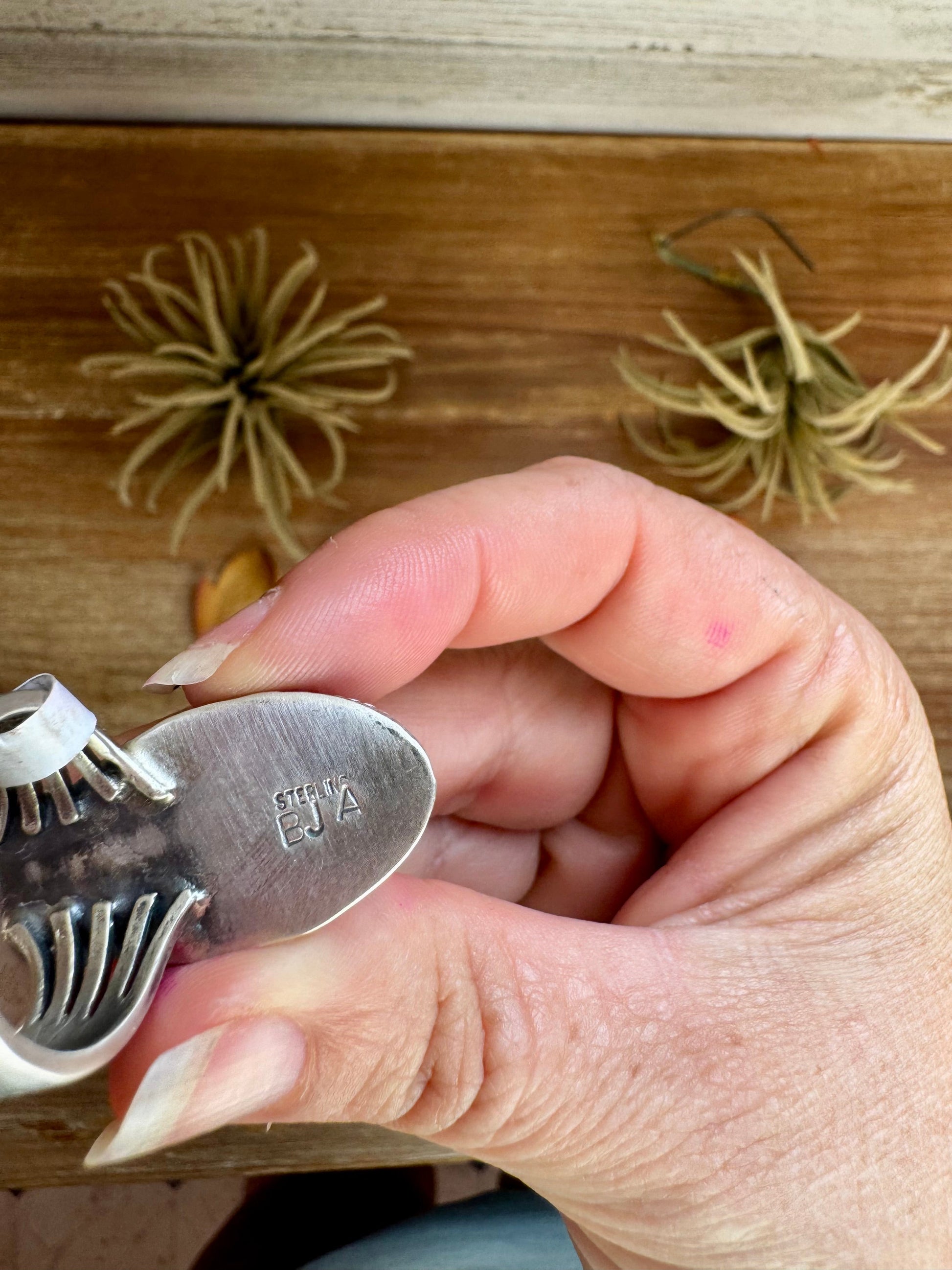 A classic concho style brought to life with stunning green turquoise. This ring is handmade by Navajo artist Boyd Ashley and features a bold sterling silver concho design with a vibrant green turquoise stone at the center. Size 9. Perfect as a statement ring or for everyday wear with a western edge.