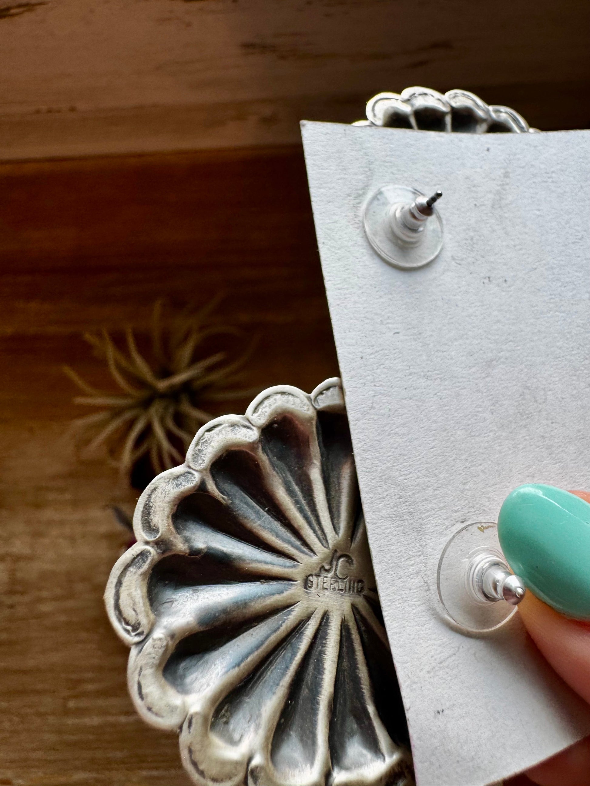 Handmade in the USA, these large sterling silver concho earrings feature vivid red spiny oyster centers for a bold and eye-catching look. Stamped “JC Sterling” for authenticity, they’re Native made with careful silverwork detail. Despite their size, they are surprisingly lightweight and comfortable, designed with a stud post on top for secure wear. A gorgeous statement pair that brings Southwestern style to any outfit.