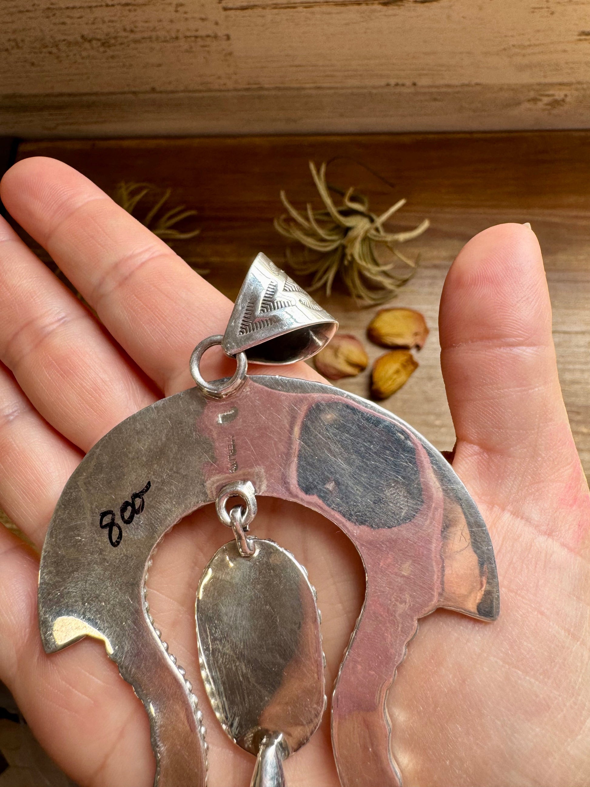 Large Sterling Silver & Kingman Turquoise Pendant – Native Made by L. – Fits 12mm Pearls