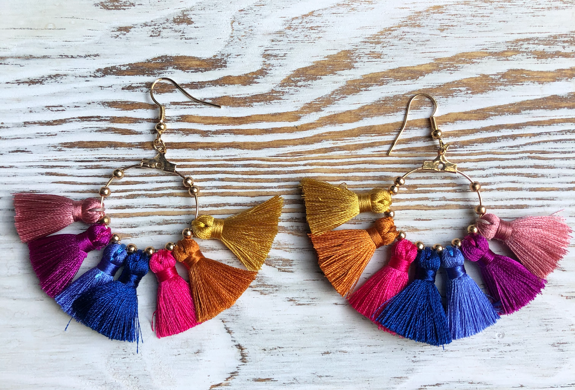 Light Pinks Multi Tassel Gold Hoop Earrings