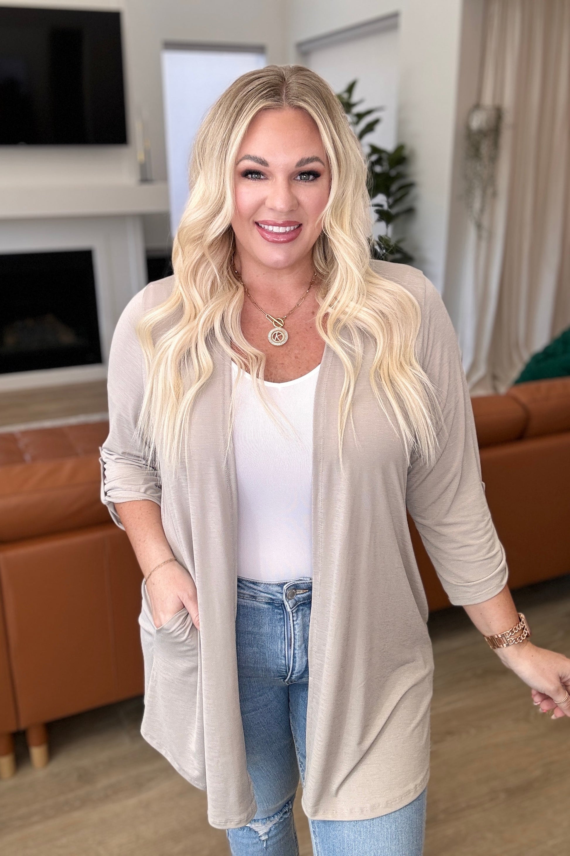 Introducing the Lizzy Cardigan in Taupe, the perfect blend of style and comfort. Stay cool with the Bulagri fabric and enjoy wrinkle-resistant and lightweight properties. Featuring faux button tab 3/4 sleeves, an open front, and a pleated back for a unique look. With functional pockets and a comfortable fit, this cardigan is a must-have. Order now for a fresh and playful look (and cozy comfort)!