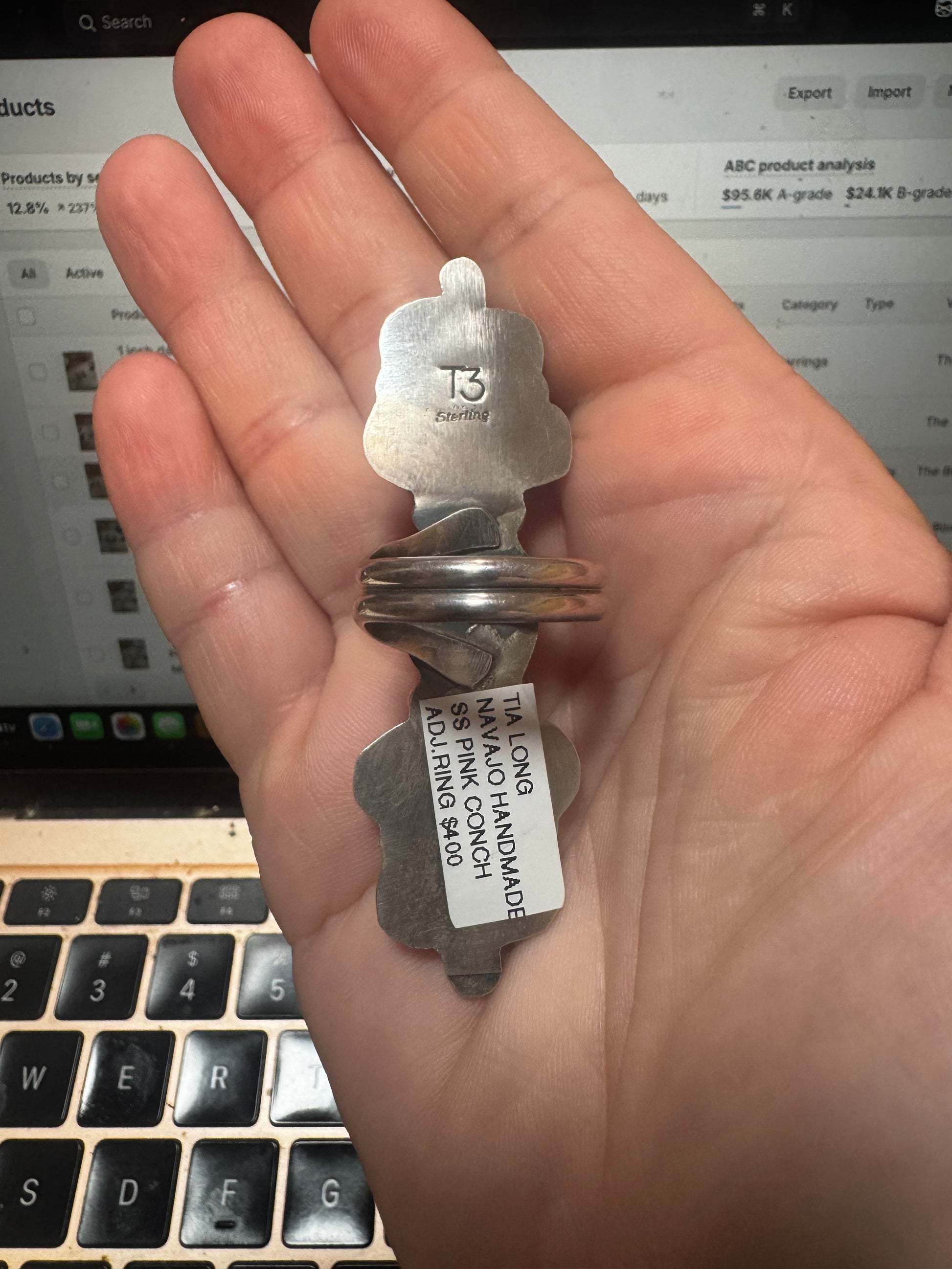 Long Ring -adjustable - pink conch and sterling silver III