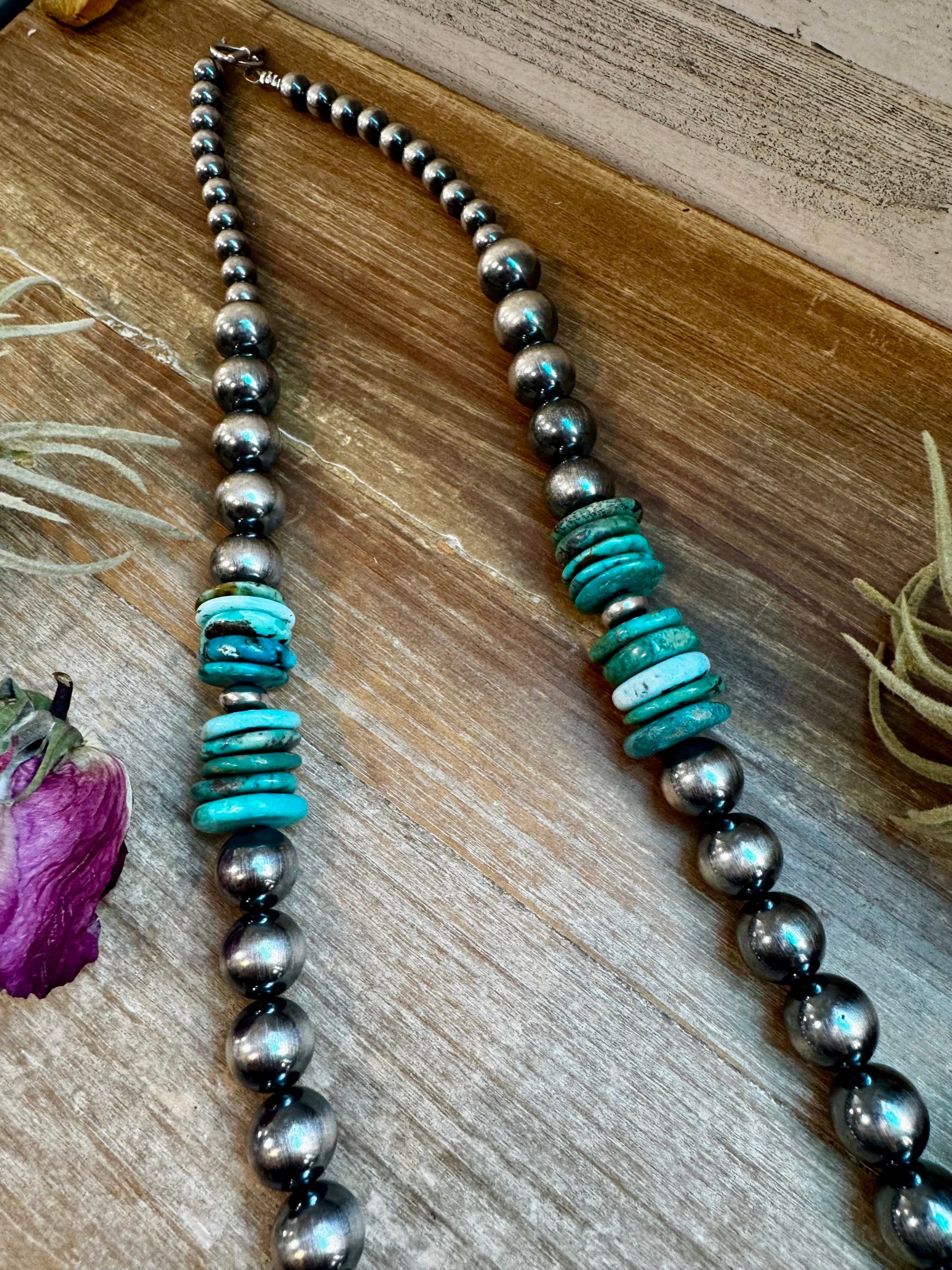 NFR Collection Necklace – 8mm, 10mm & 14mm Sterling Silver Pearls with Turquoise – Handmade by The Bijoux FAB – 37"