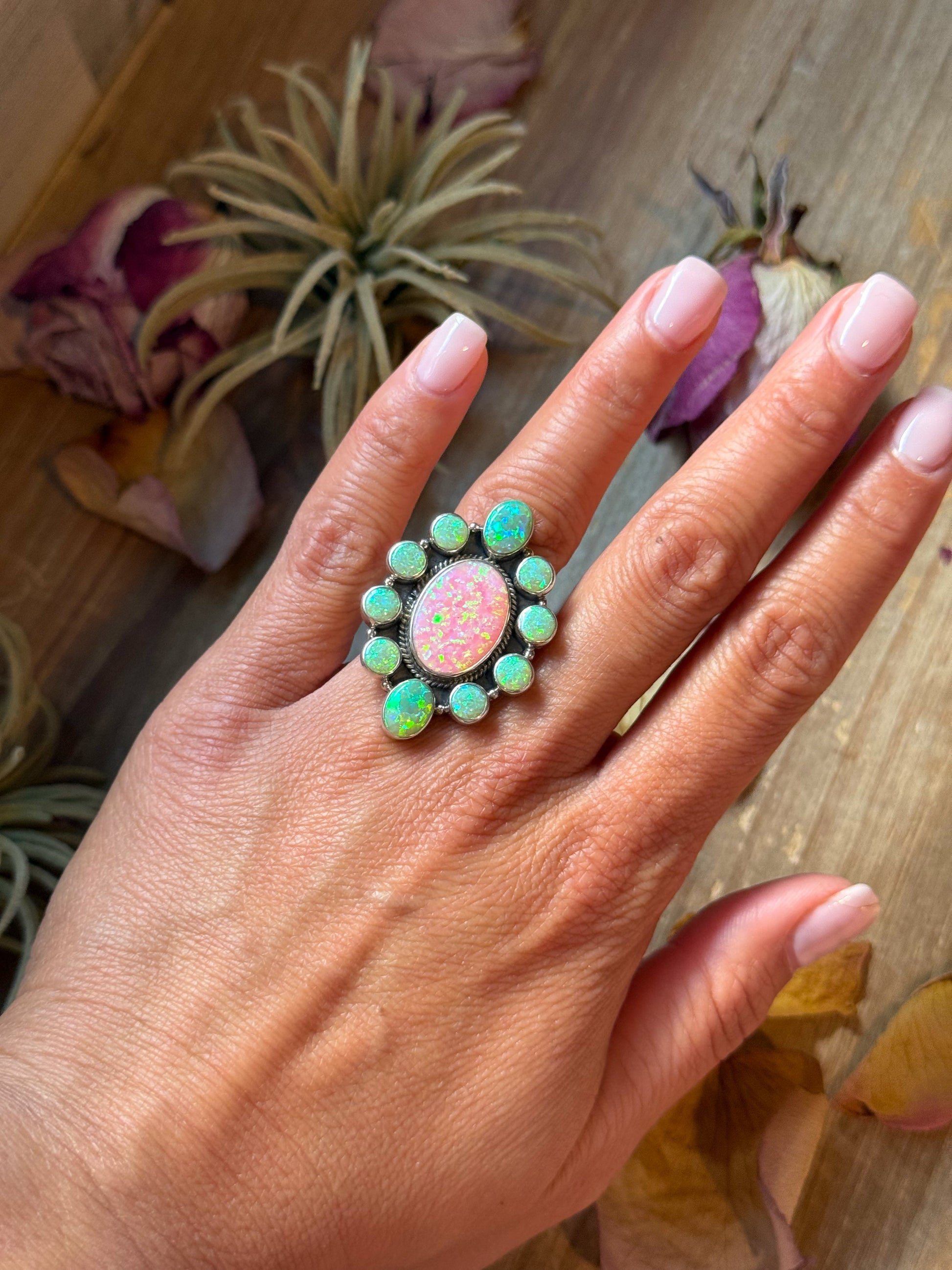 Stamped STERLING, this size 6 ring was crafted with care and attention to detail. Each opal has its own unique play of color, ensuring that every piece is one-of-a-kind. Perfect for adding a touch of sparkle to your everyday look or gifting to someone special.