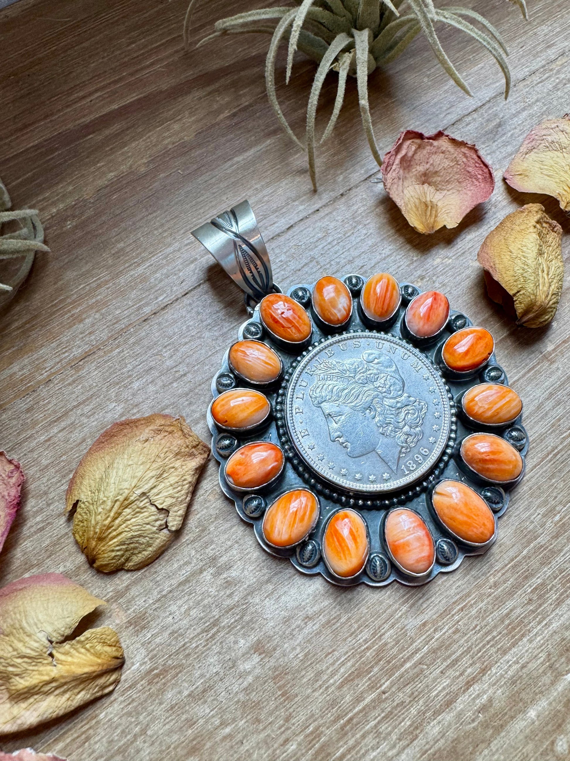 Orange Spiny Oyster & Silver Coin Pendant – Signed by Gabby