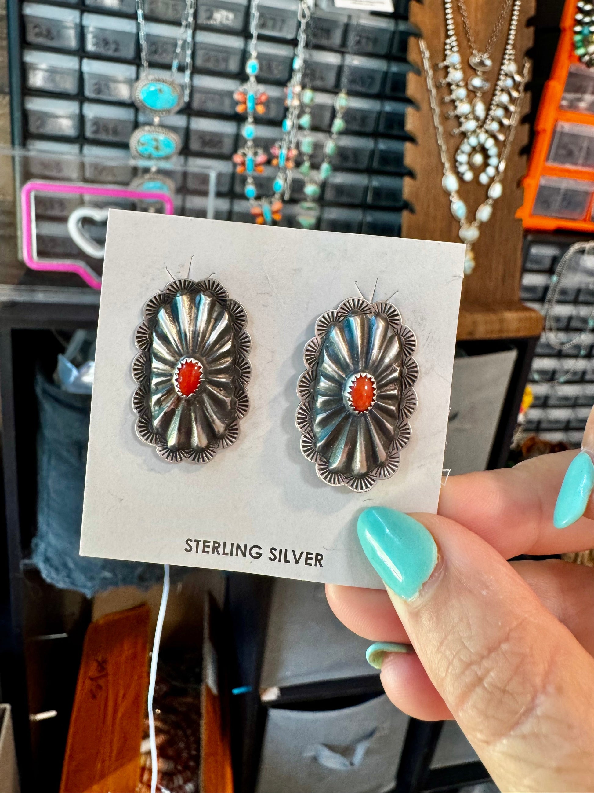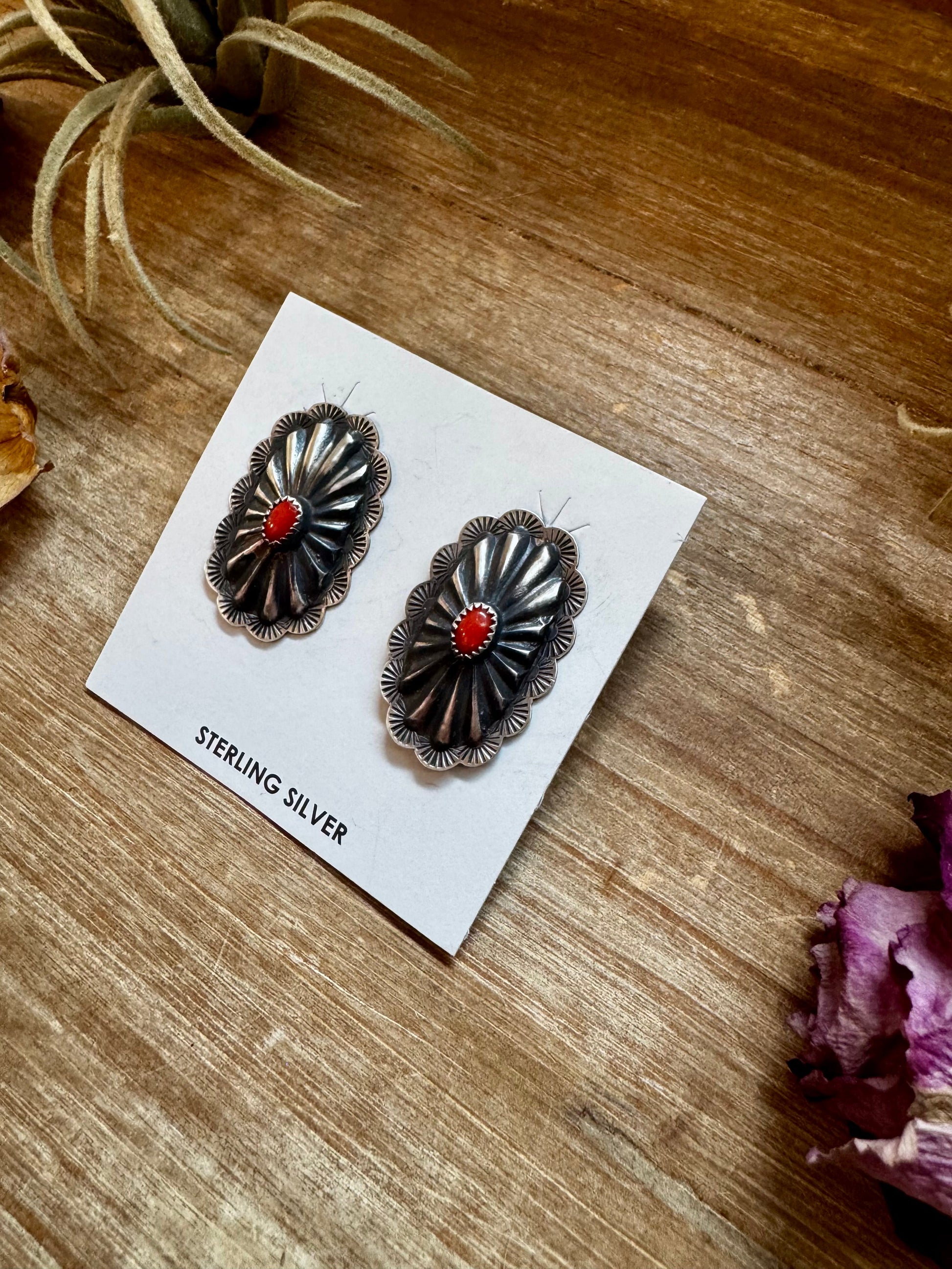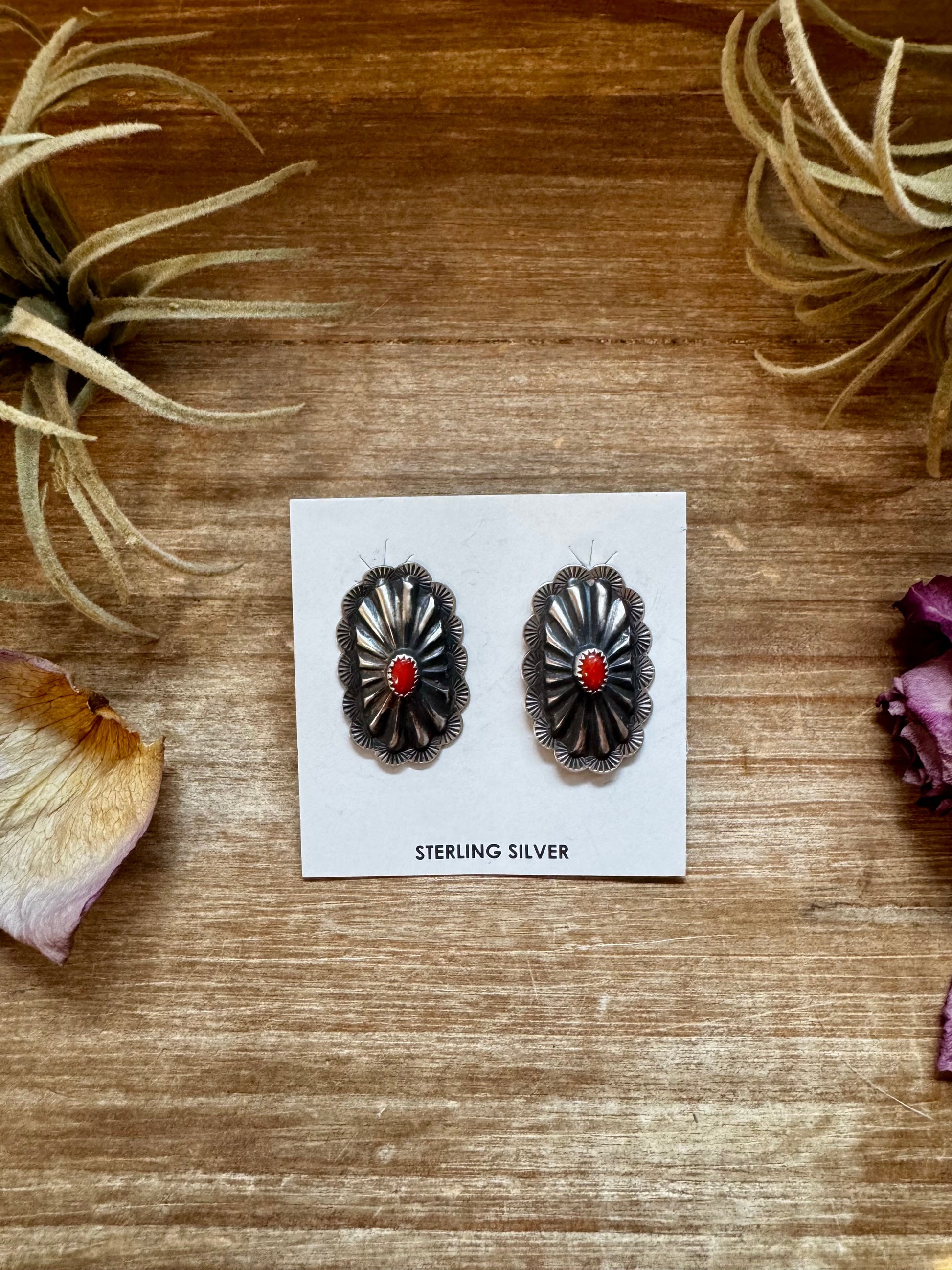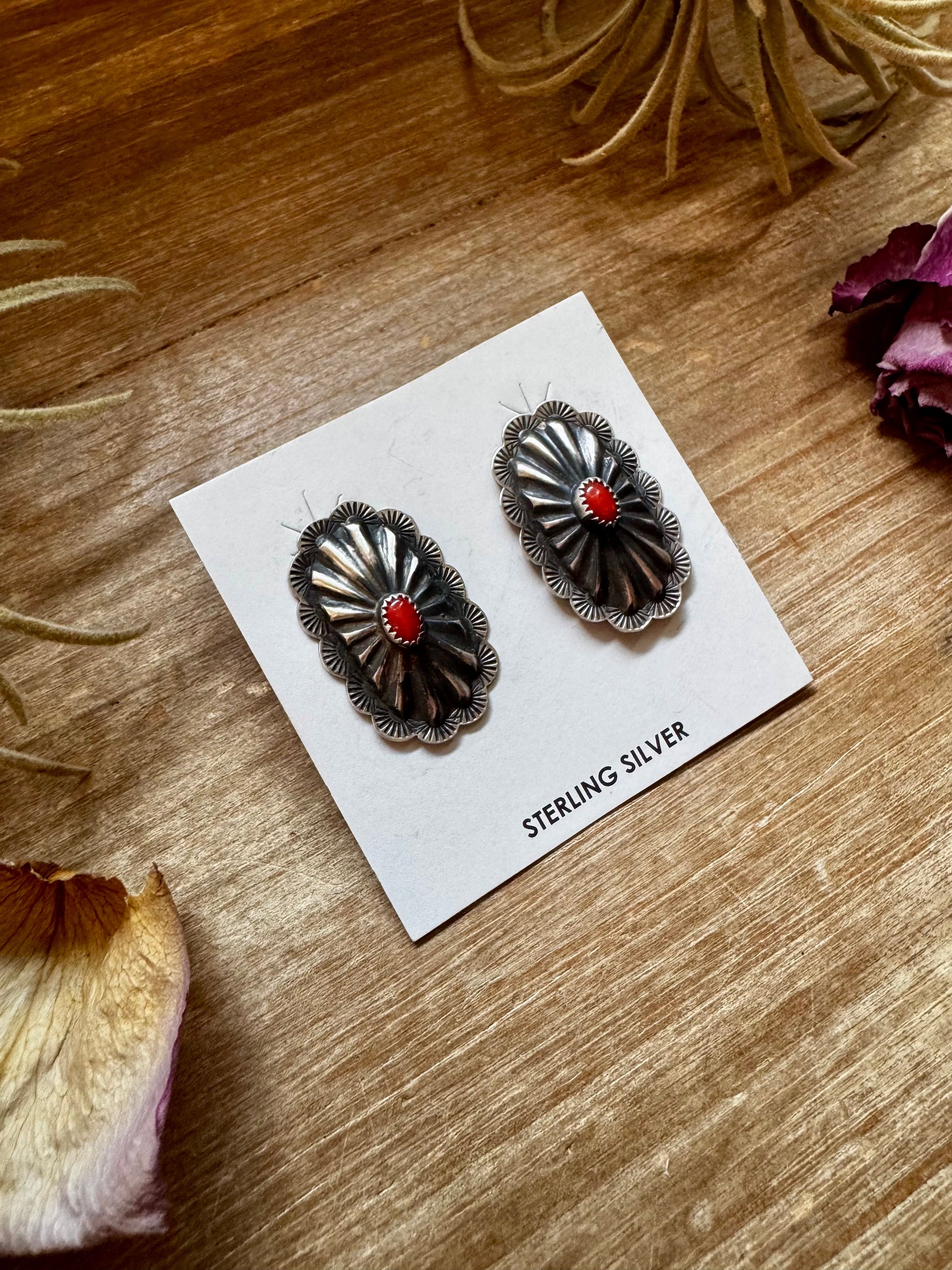 These one-of-a-kind stud earrings feature vivid red stones set in sterling silver. Designed in a classic post style, they are lightweight, easy to wear, and perfect for daily use. Handmade in the USA, this pair has no stamp but is crafted in sterling silver. Sterling silver stud earrings with red stones