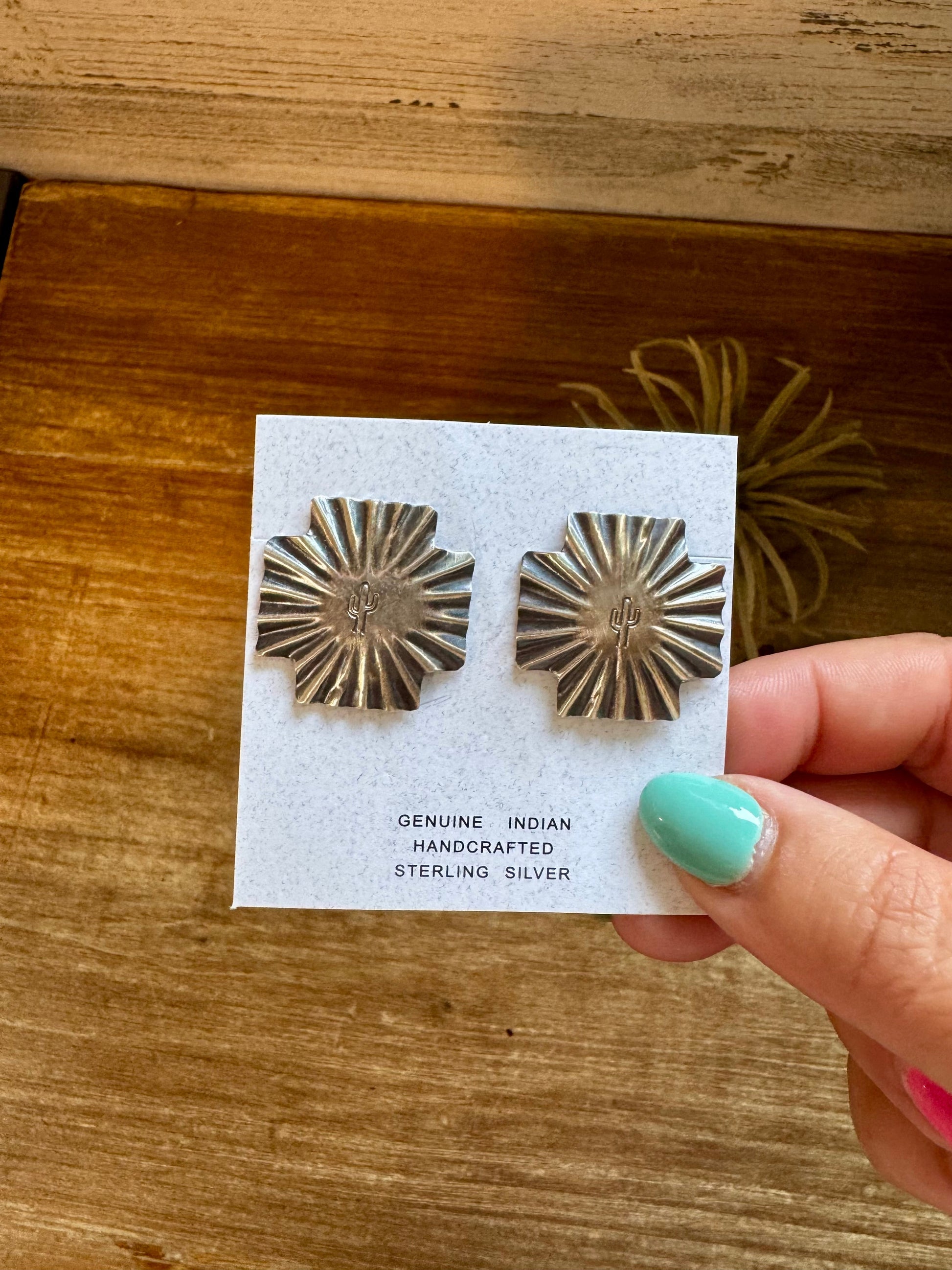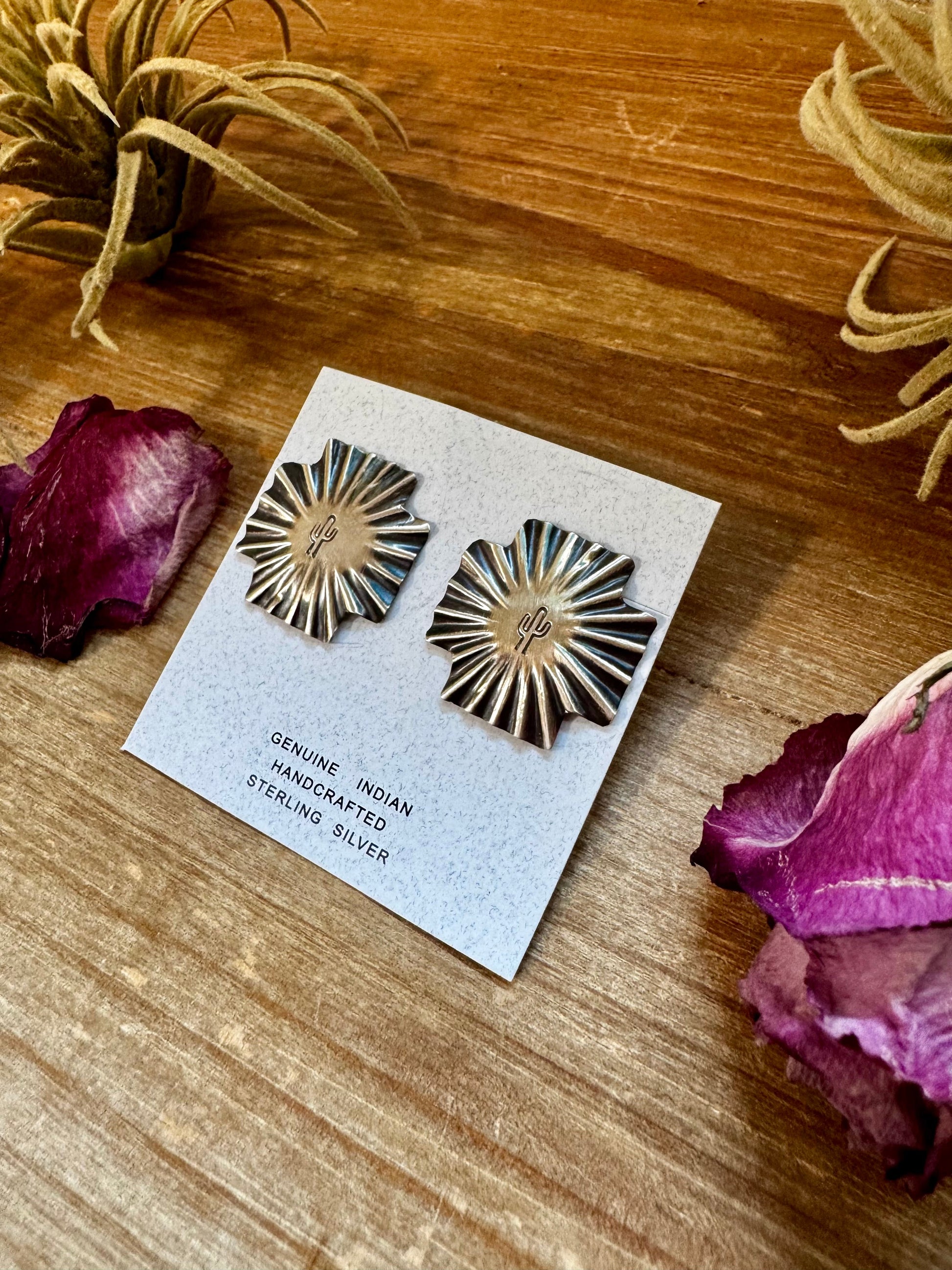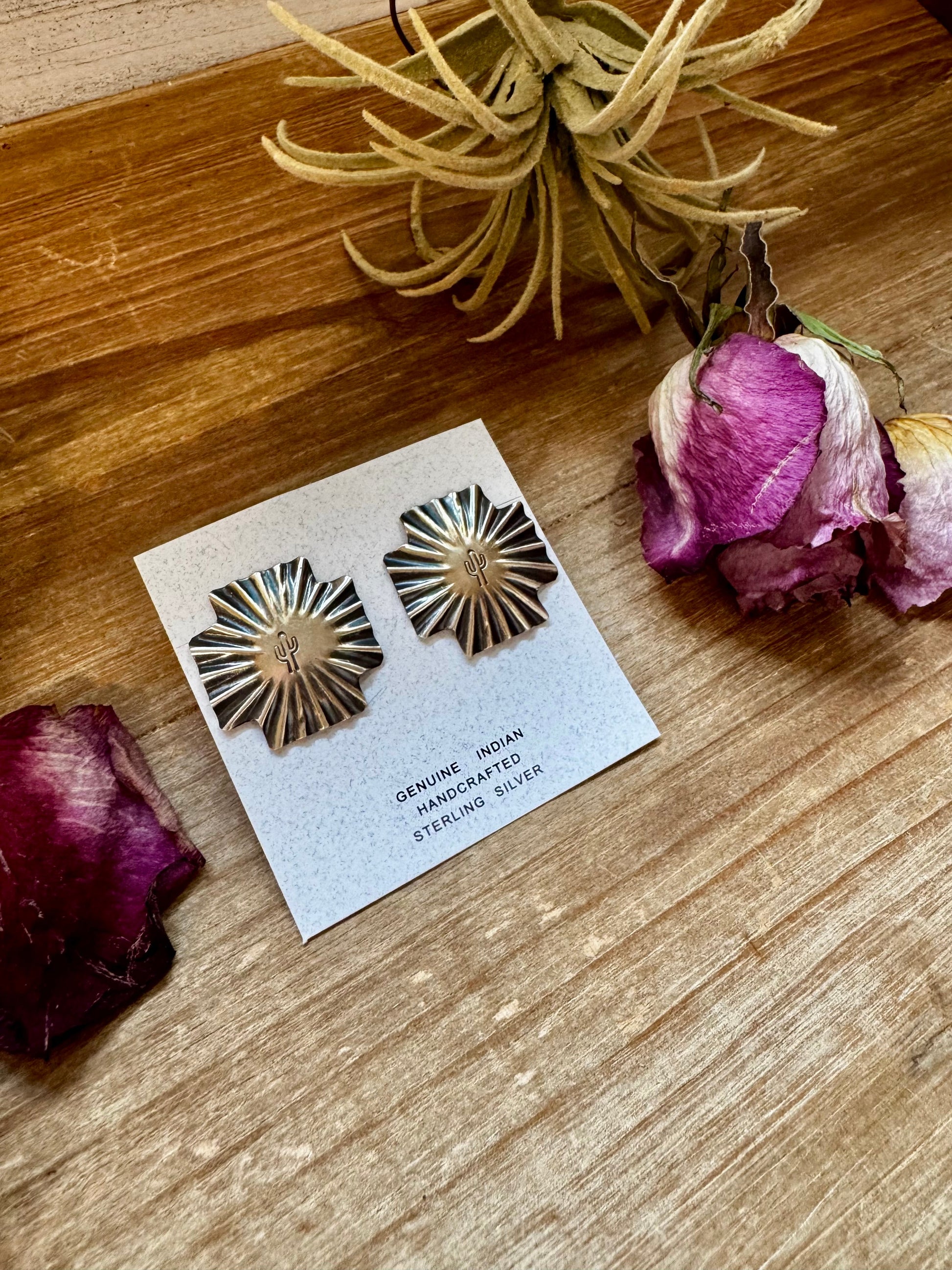 Handmade in sterling silver, these stud earrings are shaped as square crosses and stamped with a cactus design at the center. Lightweight and versatile, they’re perfect for daily wear while adding a touch of Southwestern charm. The back is stamped for authenticity. Simple, unique, and crafted in the USA.