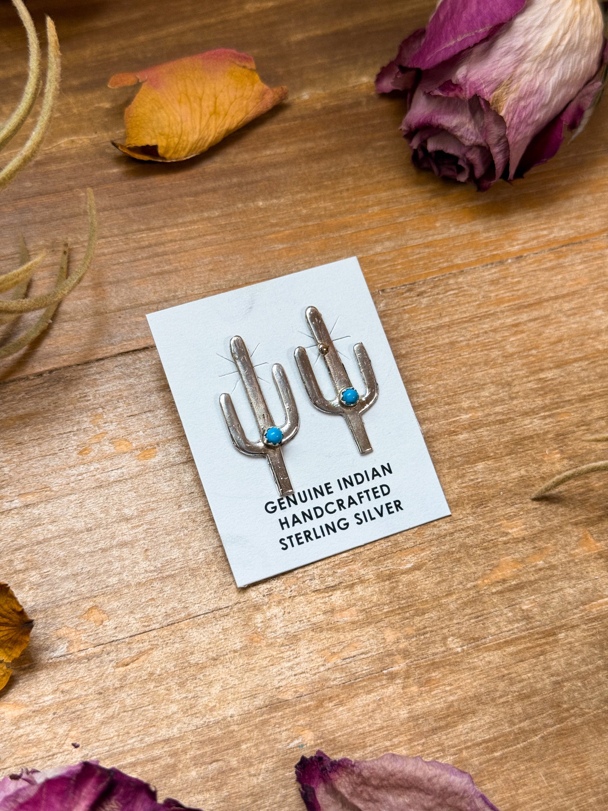 Sterling Silver Cactus Stud Earrings with Kingman Turquoise