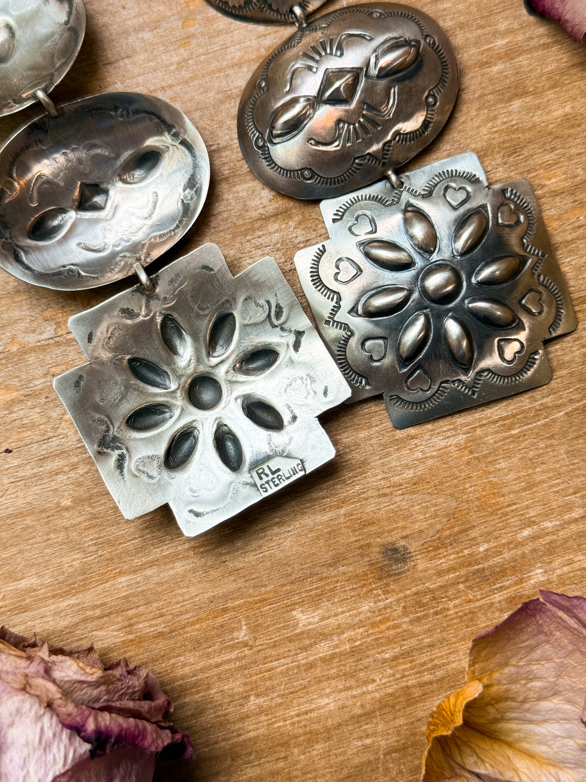 These sterling silver concho dangle earrings are Native made by renowned Navajo artist Rita Lee, celebrated for her detailed silverwork and timeless Southwestern designs. Each pair features intricate concho engraving and a lightweight feel despite their bold size. Stamped “Sterling” and handmade in the USA, these earrings are a true collector’s treasure — especially as this famous artist nears retirement. Only one pair available.
