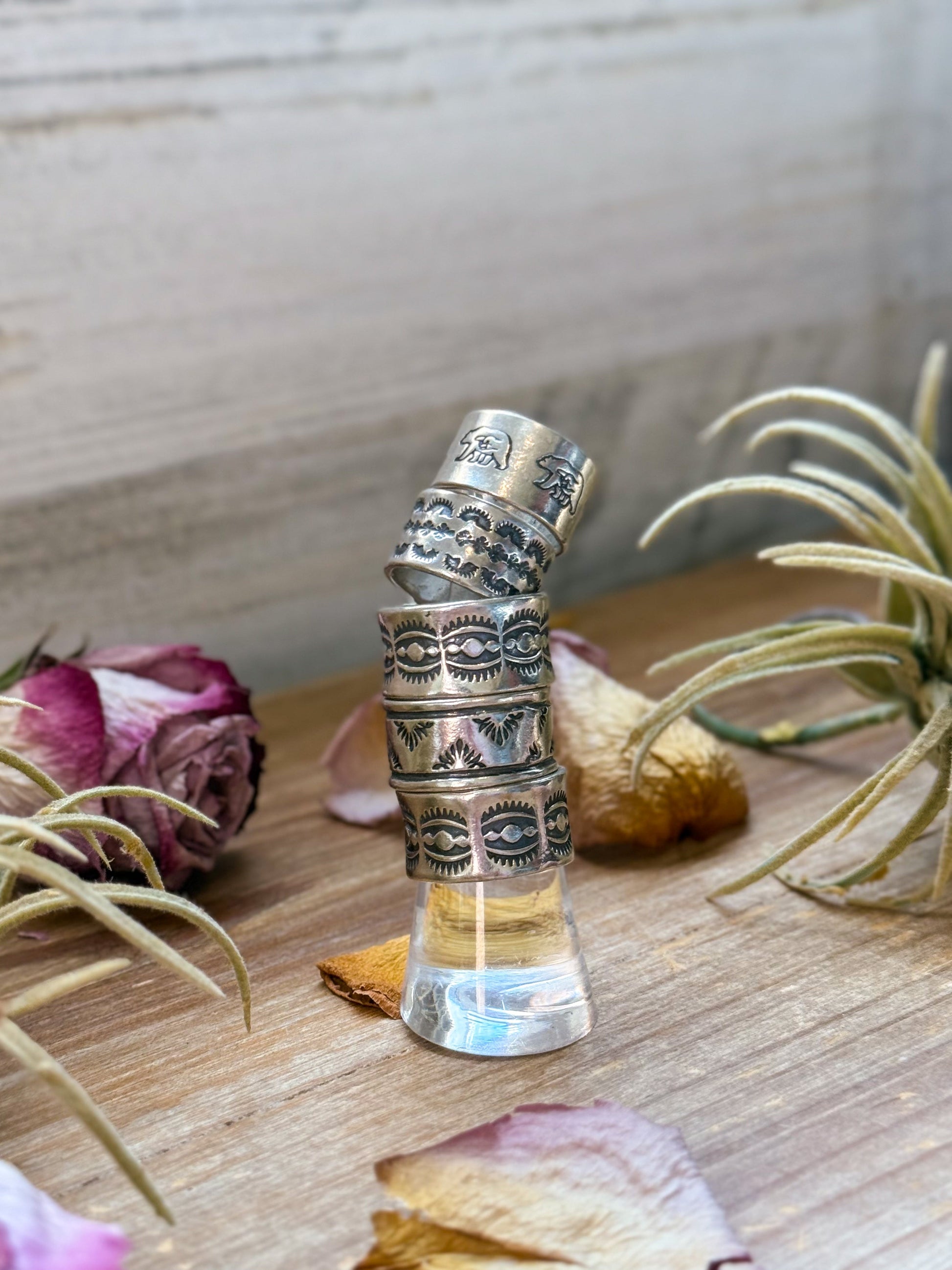 This Sterling Silver Hand-Milled Wide Band Ring features Jason Ogg’s detailed Mini Sun Ray stamp work, creating a clean, bright, and timeless Southwestern design.