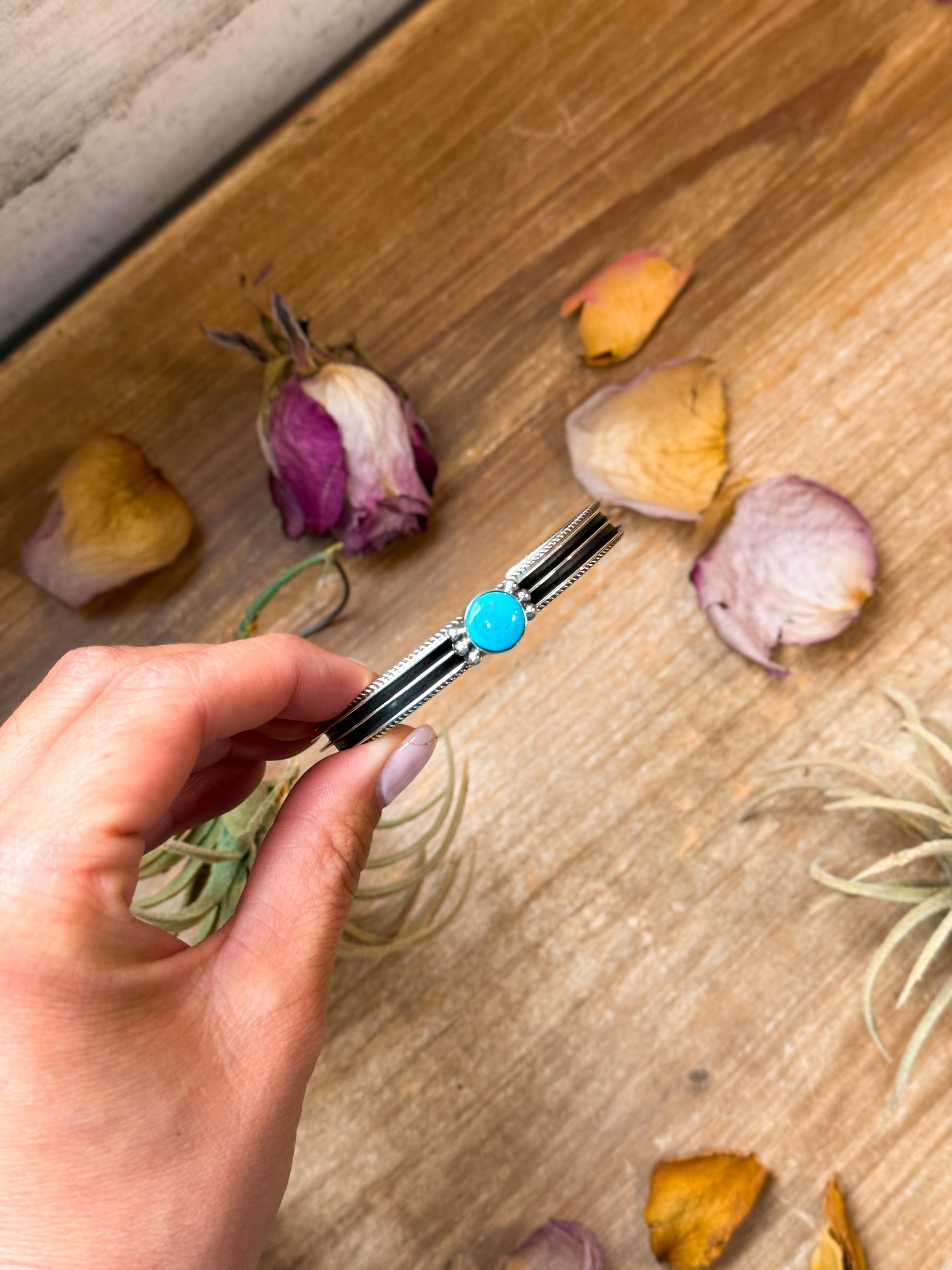 This Native made sterling silver cuff bracelet features genuine turquoise and showcases a thick, high-quality silver band with beautiful craftsmanship. Stamped with a “Y” hallmark and “Sterling,” it’s proudly handmade in the USA. The cuff has a slight natural give for easy adjustment and a comfortable fit, while the turquoise stone adds a timeless Southwestern touch. A durable and collectible piece that’s both bold and wearable.